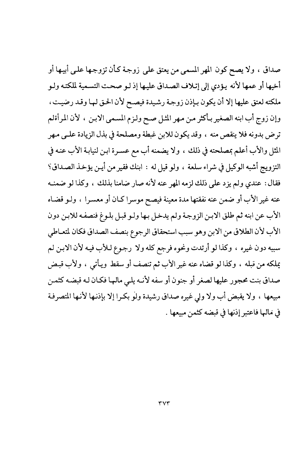 صداق، ولا يصح كون المهر المسمى من يعتق على زوجة كان تزوجها على أبيها أو أخيها أو عمها لأنه يؤدي إلى إتلاف الصداق عليها إذ لو صحت التسمية لملكته ولو ملكته لعتق عليها إلا أن يكون بإذن زوجة رشيدة فيصح لأن الحق لها وقد رضيت، وإن زوج أب ابنه الصغير بأكثر من مهر المثل صح ولزم المسمى الابن، لأن المرأة لم ترض بدونه فلا ينقص منه، وقد يكون للابن غبطة ومصلحة في بذل الزيادة على مهر المثل والأب أعلم بمصلحته في ذلك، ولا يضمنه أب مع عسرة ابن لنيابة الأب عنه في التزويج أشبه الوكيل في شراء سلعة، ولو قيل له: ابنك فقير من أين يؤخذ الصداق؟ فقال: عندي ولم يزد على ذلك لزمه المهر عنه لأنه صار ضامنا بذلك، وكذا لو ضمنه عنه غير الأب أو ضمن عنه نفقتها مدة معينة فيصح موسرا كان أو معسرا، ولو قضاه الأب عن ابنه ثم طلق الابن الزوجة ولم يدخل بها ولو قبل بلوغ فنصفه للابن دون الأب لأن الطلاق من الابن وهو سبب استحقاق الرجوع بنصف الصداق فكان لمتعاطي سببه دون غيره، وكذا لو أرتدت ونحوه فرجع كله ولا رجوع للأب فيه لأن الابن لم يملكه من قبله، وكذا لو قضاه عنه غير الأب ثم تنصف أو سقط ويأتي، ولأب قبض صداق بنت محجور عليها لصغر أو جنون أو سفه لأنه يلي مالها فكان له قبضه كثمن مبيعها، ولا يقبض أب ولا ولي غيره صداق رشيدة ولو بكرا إلا بإذنها لأنها المتصرفة في مالها فاعتبر إذنها في قبضه كثمن مبيعها.
