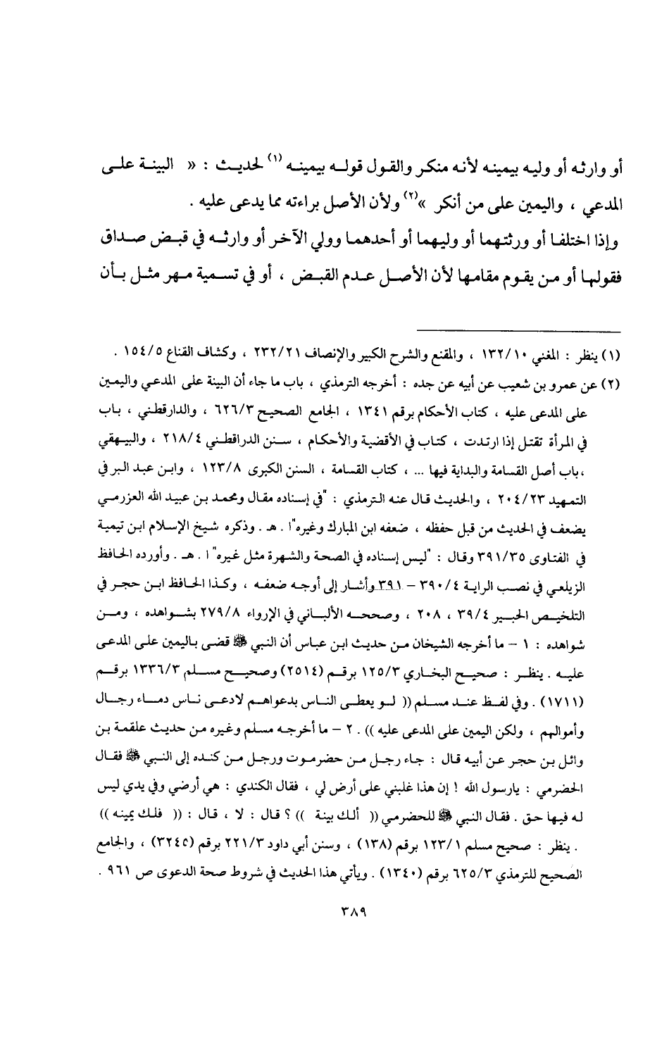 2 - ما أخرجه مسلم وغيره من حديث علقمة بن وائل بن حجر عن أبيه قال: جاء رجل من حضرموت ورجل من كنده إلى النبي -صلى اللَّه عليه وسلم- فقال الحضرمي: يا رسول اللَّه! إن هذا غلبني على أرض لي، فقال الكندي: هي أرضي وفي يدي ليس له فيها حق. فقال النبي -صلى اللَّه عليه وسلم- للحضرمي "ألك بينة"؟ قال: لا، قال: "فلك يمينه". ينظر: صحيح مسلم 1/ 123 برقم (138)، وسنن أبي داود 3/ 221 برقم (3245)، والجامع الصحيح للترمذي 3/ 625 برقم (1340). ويأتي هذا الحديث في شروط صحة الدعوى ص 961.