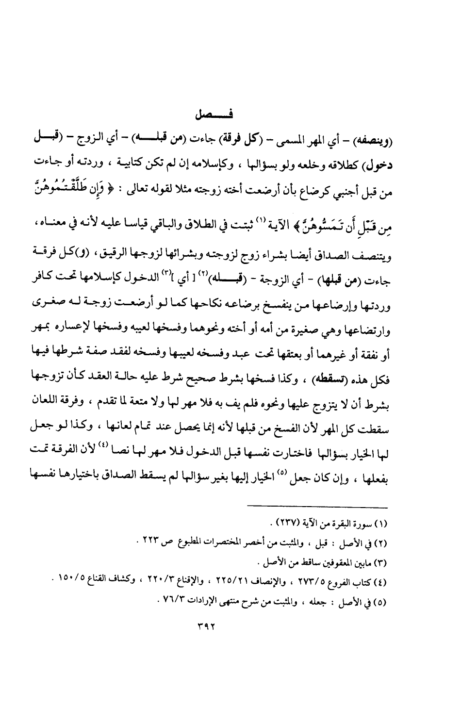 (وينصفه) -أي المهر المسمى- (كل فرقة) جاءت (من قبله) -أي الزوج- (قبل دخول) كطلاقه وخلعه ولو بسؤالها، وكإسلامه إن لم تكن كتابية، وردته أو جاءت من قبل أجنبي كرضاع بأن أرضعت أخته زوجته مثلا لقوله تعالى: {وَإِنْ طَلَّقْتُمُوهُنَّ مِنْ قَبْلِ أَنْ تَمَسُّوهُنَّ} الآية (¬1) ثبتت في الطلاق والباقي قياسا عليه لأنه في معناه، ويتنصف الصداق أيضا بشراء زوج لزوجته وبشرائها لزوجها الرقيق، (و) كل فرقة جاءت (من قبلها) -أي الزوجة- (قبله) (¬2) [أي] (¬3) الدخول كإسلامها تحت كافر وردتها وإرضاعها من ينفسخ برضاعه نكاحها كما لو أرضعت زوجة له صغرى وارتضاعها وهي صغيرة من أمه أو أخته ونحوهما وفسخها لعيبه وفسخها لإعساره بمهر أو نفقة أو غيرهما أو بعتقها تحت عبد وفسخه لعيبها وفسخه لفقد صفة شرطها فيها فكل هذه (تسقطه)، وكذا فسخها بشرط صحيح شرط عليه حالة العقد كأن تزوجها بشرط أن لا يتزوج عليها ونحوه فلم يف به فلا مهر لها ولا متعة لما تقدم، وفرقة اللعان سقطت كل المهر لأن الفسخ من قبلها لأنه إنما يحصل عند تمام لعانها، وكذا لو جعل لها الخيار بسؤالها فاختارت نفسها قبل الدخول فلا مهر لها نصا (¬4) لأن الفرقة تمت بفعلها، وإن كان جعل (¬5) الخيار إليها بغير سؤالها لم يسقط الصداق باختيارها نفسها