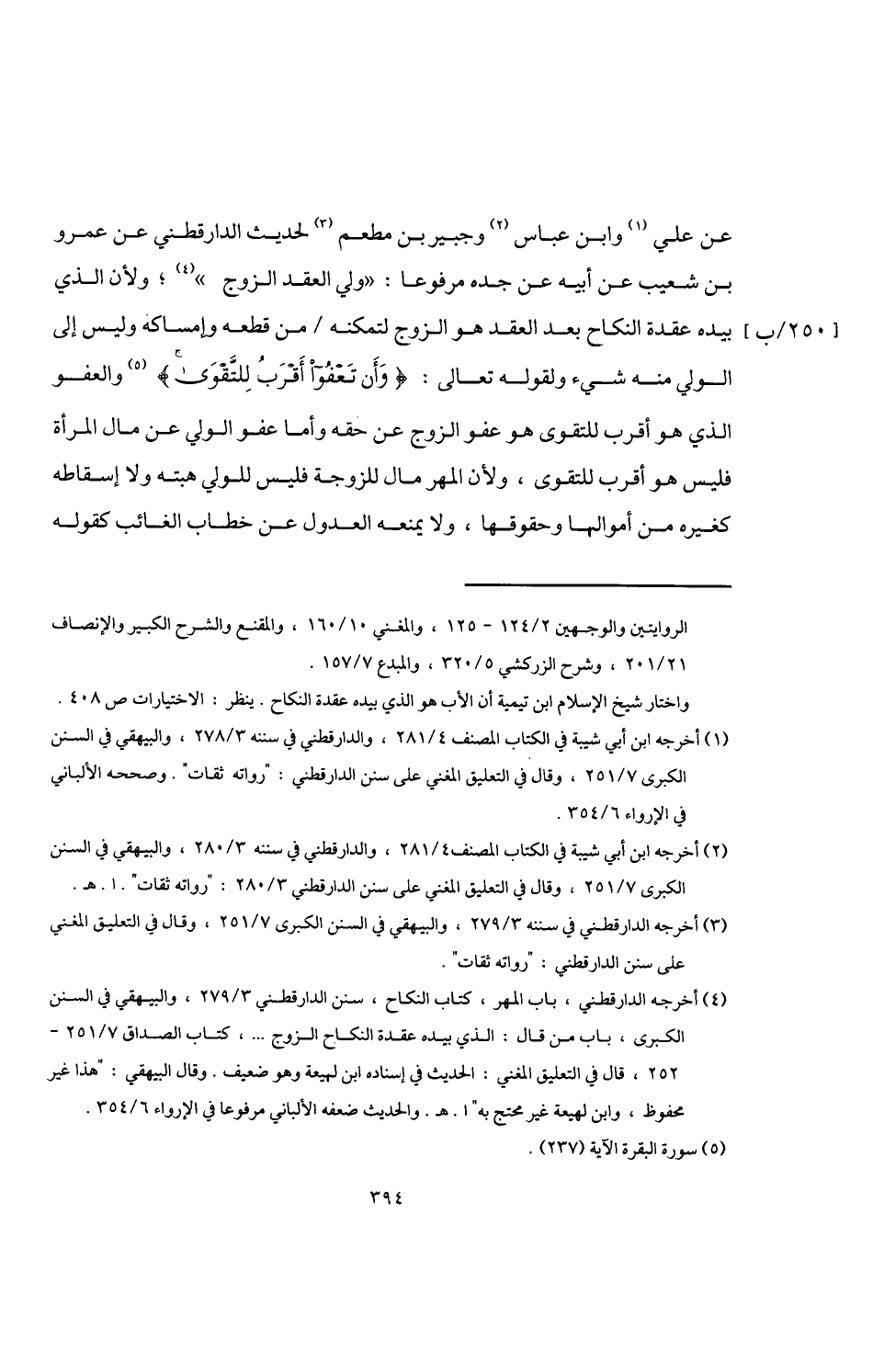 (¬4) أخرجه الدارقطني، باب المهر، كتاب النكاح، سنن الدارقطني 3/ 279، والبيهقي في السنن الكبرى، باب من قال: الذي بيده عقدة النكاح الزوج. . .، كتاب الصداق 7/ 251 - 252، قال في التعليق المغني: الحديث في إسناده ابن لهيعة وهو ضعيف. وقال البيهقي: "هذا غير محفوظ، وابن لهيعة غير محتج به" ا. هـ. والحديث ضعفه الألباني مرفوعا في الإرواء 6/ 354.