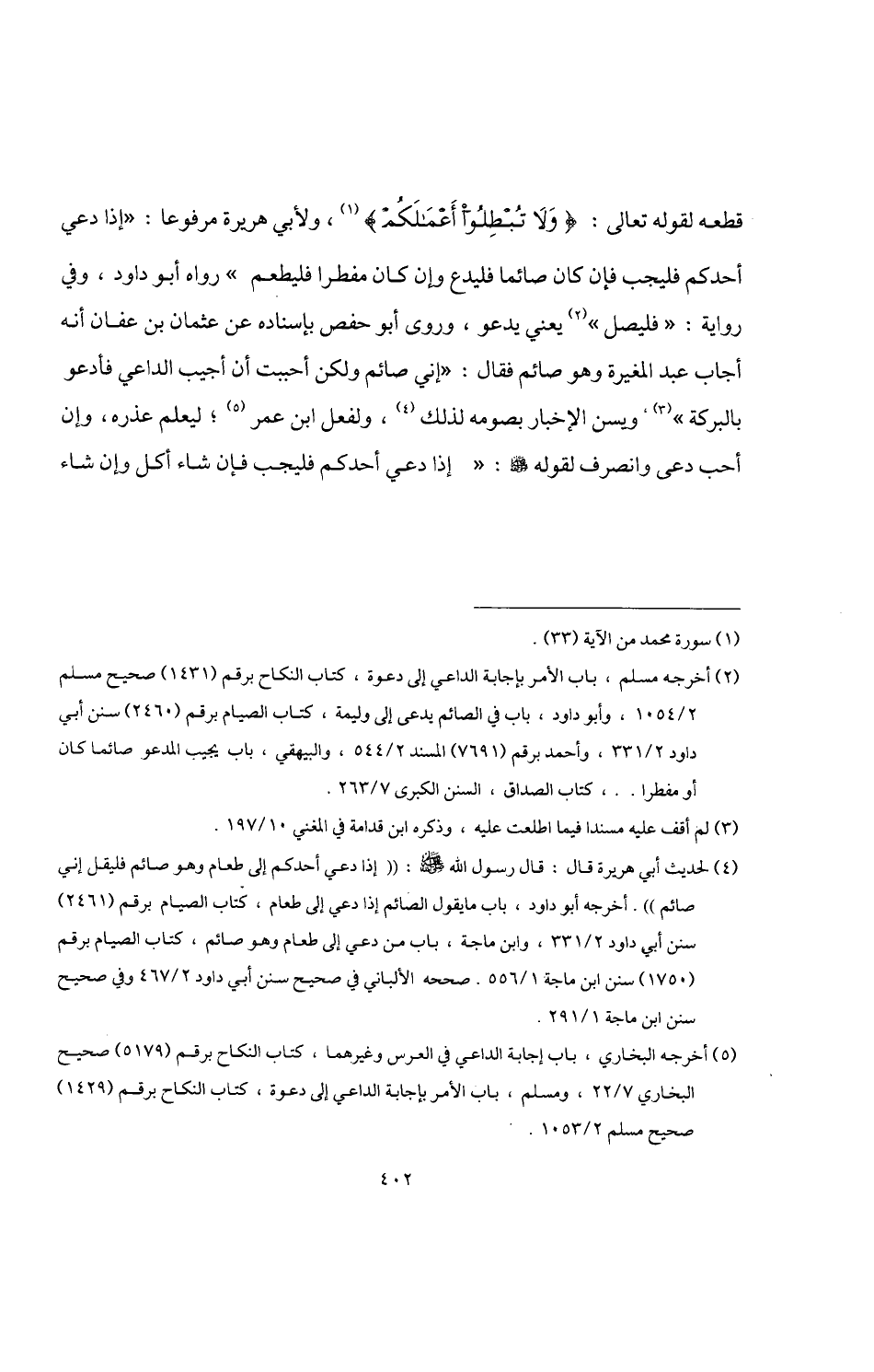 (¬2) أخرجه مسلم، باب الأمر بإجابة الداعي إلى دعوة، كتاب النكاح برقم (1431) صحيح مسلم 2/ 1054، وأبو داود، باب في الصائم يدعى إلى وليمة، كتاب الصيام برقم (2460) سنن أبي داود 2/ 331، وأحمد برقم (7691) المسند 2/ 544، والبيهقي، باب يجيب المدعو صائما كان أو مفطرا. .، كتاب الصداق، السنن الكبرى 7/ 263.