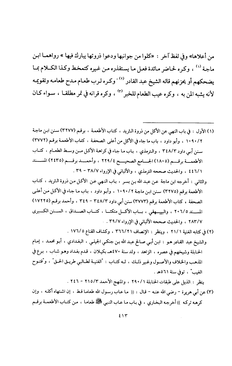 (¬1) الأول: في باب النهي عن الأكل من ذروة الثريد، كتاب الأطعمة، برقم (3277) سنن ابن ماجة 2/ 1090، وأبو داود، باب ما جاء في الأكل من أعلى الصحفة، كتاب الأطعمة برقم (3772) سنن أبي داود 3/ 348، والترمذي، باب ما جاء في كراهة الأكل من وسط الطعام، كتاب الأطعمة برقم (1805) الجامع الصحيح 4/ 229، وأحمد برقم (2435) المسند 1/ 446، والحديث صححه الترمذي، والألباني في الإرواء 7/ 38 - 39.