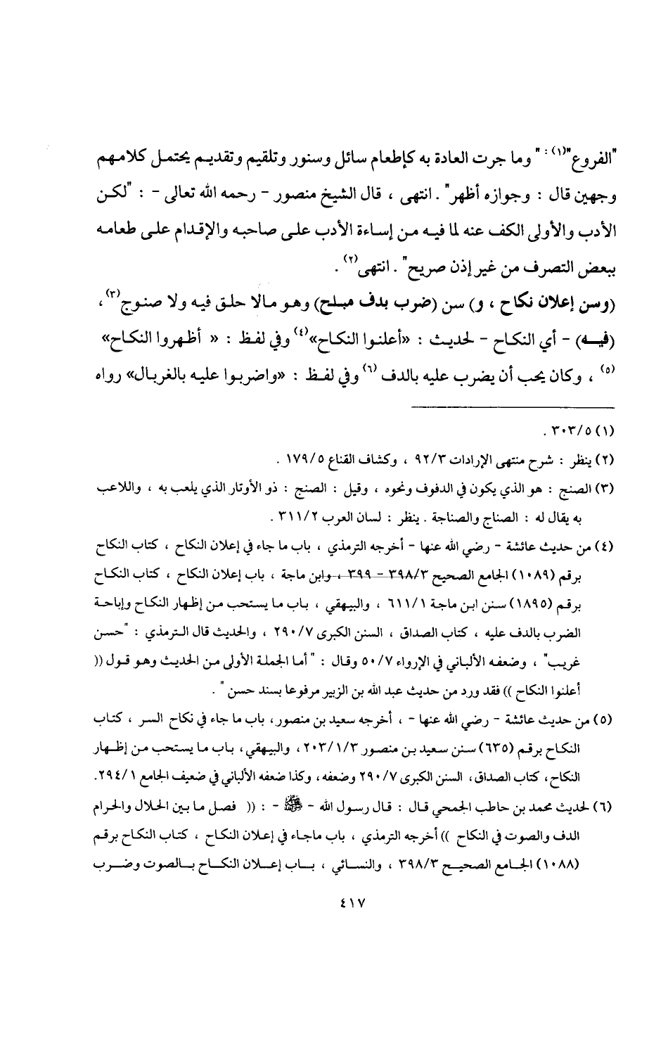 (وسن إعلان نكاح، و) سن (ضرب بدف مبدح) وهو ما لا حلق فيه ولا صنوج (¬3)، (فيه) -أي النكاح- لحديث: "أعلنوا النكاح" (¬4) وفي لفظ: "أظهروا النكاح" (¬5)، وكان يحب أن يضرب عليه بالدف (¬6) وفي لفظ: "واضربوا عليه بالغربال" رواه