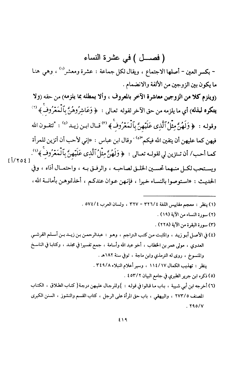 - بكسر العين- أصلها الاجتماع، ويقال لكل جماعة: عشرة ومعشر (¬1)، وهي هنا، ما يكون بين الزوجين من الألفة والانضمام.