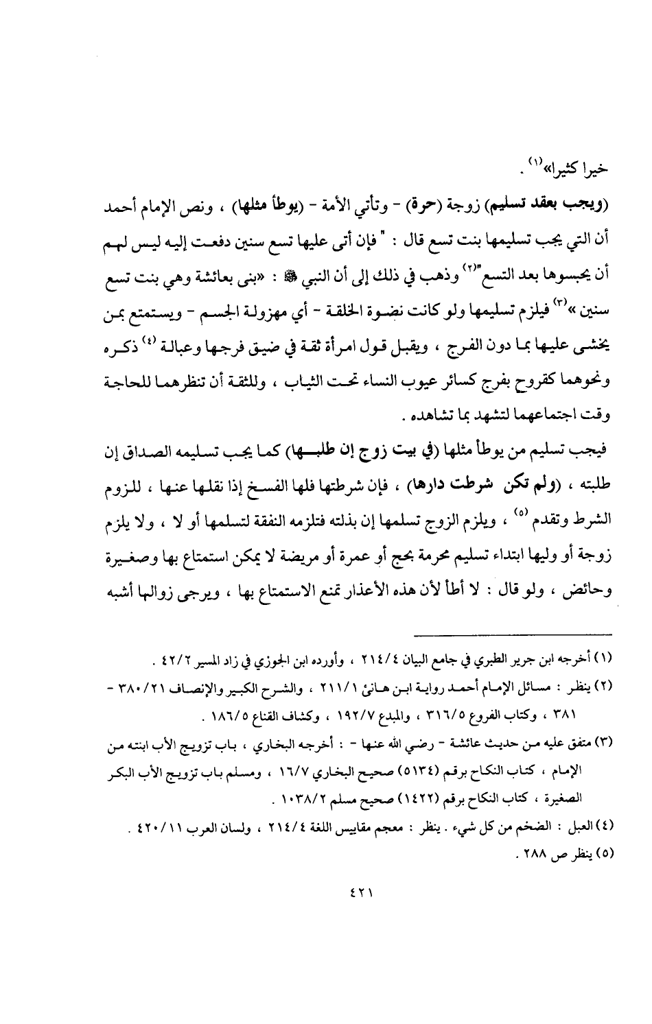 (ويجب بعقد تسليم) زوجة (حرة) -وتأتي الأمة- (يوطأ مثلها)، ونص الإمام أحمد أن التي يجب تسليمها بنت تسع قال: "فإن أتى عليها تسع سنين دفعت إليه ليس لهم أن يحبسوها بعد التسع" (¬2) وذهب في ذلك إلى أن النبي -صلى اللَّه عليه وسلم-: بنى بعائشة وهي بنت تسع سنين" (¬3) فيلزم تسليمها ولو كانت نضوة الخلقة -أي مهزولة الجسم- ويستمتع بمن يخشى عليها بما دون الفرج، ويقبل قول امرأة ثقة في ضيق فرجها وعبالة (¬4) ذكره ونحوهما كقروح بفرج كسائر عيوب النساء تحت الثياب، وللثقة أن تنظرهما للحاجة وقت اجتماعهما لتشهد بما تشاهده.