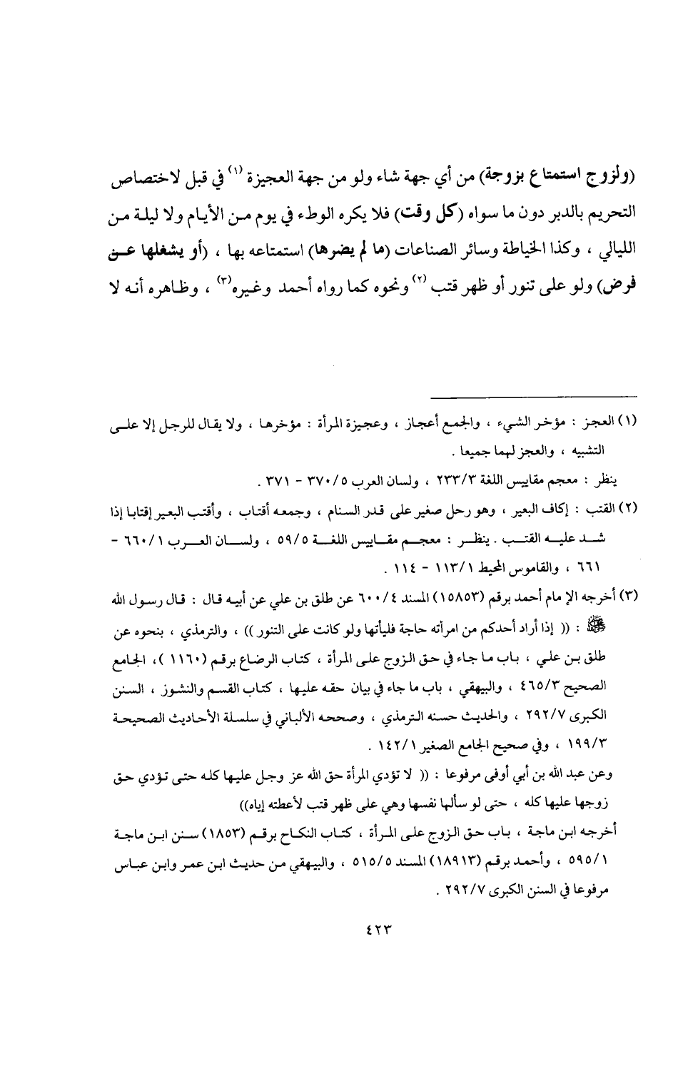 (ولزوج استمتاع بزوجة) من أي جهة شاء ولو من جهة العجيزة (¬1) في قبل لاختصاص التحريم بالدبر دون ما سواه (كل وقت) فلا يكره الوطء في يوم من الأيام ولا ليلة من الليالي، وكذا الخياطة وسائر الصناعات (ما لم يضرها) استمتاعه بها، (أو يشغلها عن فرض) ولو على تنور أو ظهر قتب (¬2) ونحوه كما رواه أحمد وغيره (¬3)، وظاهره أنه لا