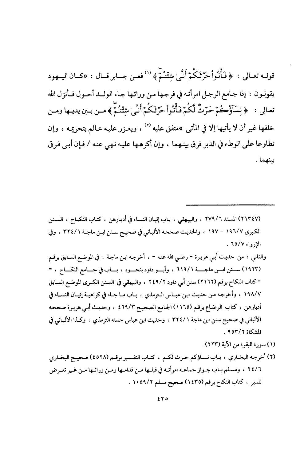 (¬2) أخرجه البخاري، باب نساؤكم حرث لكم، كتاب التفسير برقم (4528) صحيح البخاري 6/ 24، ومسلم باب جواز جماعه امرأته في قبلها من قدامها ومن ورائها من غير تعرض للدبر، كتاب النكاح برقم (1435) صحيح مسلم 2/ 1059.