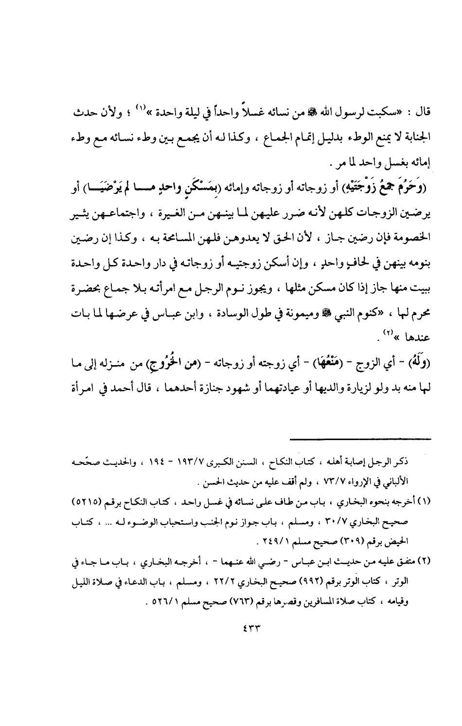 (وَحَرُمَ جمعُ زَوْجَتَيْهِ) أو زوجاته أو زوجاته وإمائه (بِمَسْكَنٍ واحدٍ ما لم يَرْضَيَا) أو يرضين الزوجات كلهن لأنه ضرر عليهن لما بينهن من الغيرة، واجتماعهن يثير الخصومة فإن رضين جاز، لأن الحق لا يعدوهن فلهن المسامحة به، وكذا إن رضين بنومه بينهن في لحافٍ واحدٍ، وإن أسكن زوجتيه أو زوجاته في دار واحدة كل واحدة ببيت منها جاز إذ كان مسكن مثلها، ويجوز نوم الرجل مع امرأته بلا جماع بحضرة محرم لها, "كنوم النبي -صلى اللَّه عليه وسلم- وميمونة في طول الوسادة، وابن عباس في عرضها لما بات عندها" (¬2).