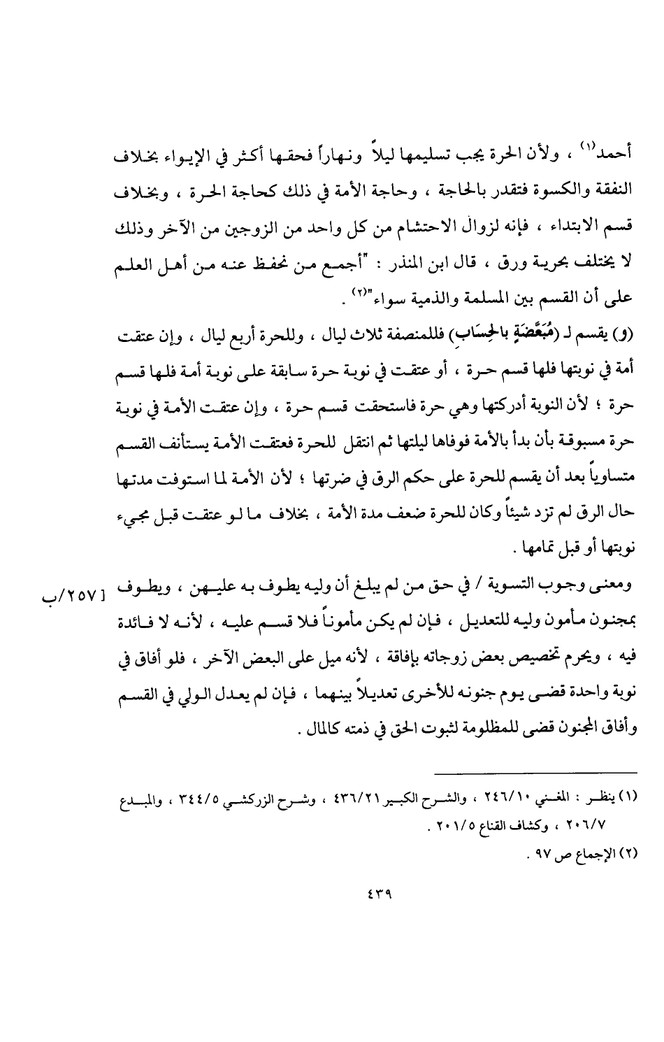 أحمد (¬1)، ولأن الحرة يجب تسليمها ليلًا ونهارًا فحقها أكثر في الإيواء بخلاف النفقة والكسوة فتقدر بالحاجة، وحاجة الأمة في ذلك كحاجة الحرة، وبخلاف قسم الابتداء، فإنه لزوال الاحتشام من كل واحد من الزوجين من الآخر وذلك لا يختلف بحرية ورق، قال ابن المنذر: "أجمع من نحفظ عنه من أهل العلم على أن القسم بين المسلمة والذمية سواء" (¬2).