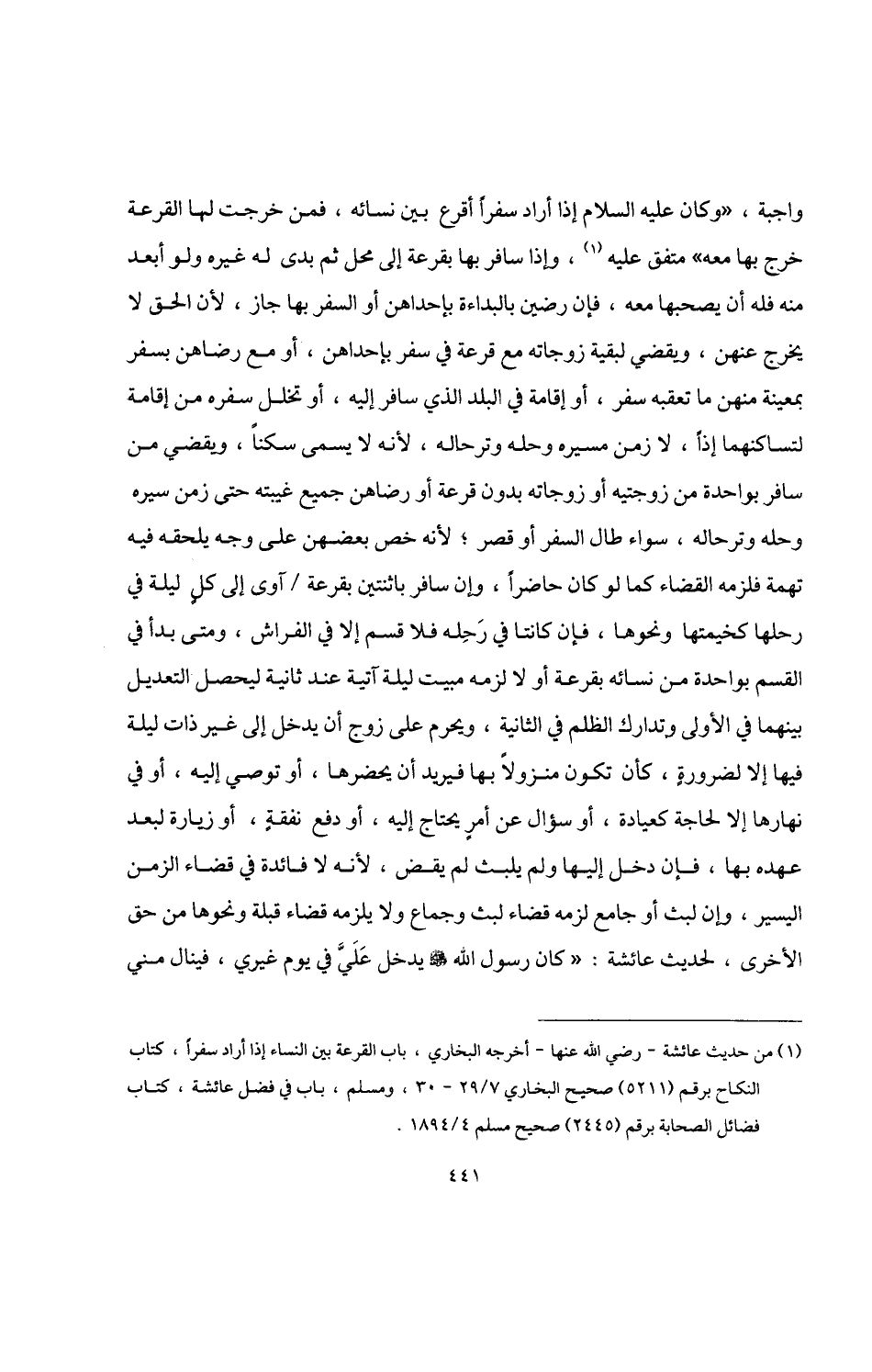 واجبة، "وكان عليه السلام إذا أراد سفرًا أقرع بين نسائه، فمن خرجت لها القرعة خرج بها معه" متفق عليه (¬1)، وإذا سافر بها بقرعة إلى محل ثم بدى له غيره ولو أبعد منه فله أن يصحبها معه، فإن رضين بالبداءة بإحداهن أو السفر بها جاز، لأن الحق لا يخرج عنهن، ويقضي لبقية زوجاته مع قرعة في سفر بإحداهن، أو مع رضاهن بسفر بمعينة منهن ما تعقبه سفر، أو إقامة في البلد الذي سافر إليه، أو تخلل سفره من إقامة لتساكنهما إذًا، لا زمن مسيره وحله وترحاله، لأنه لا يسمى سكنًا، ويقضي من سافر بواحدة من زوجتيه أو زوجاته بدون قرعة أو رضاهن جميع غيبته حتى زمن سيره وحله وترحاله، سواء طال السفر أو قصر؛ لأنه خص بعضهن على وجه يلحقه فيه تهمة فلزمه القضاء كما لو كان حاضرًا، وإن سافر باثنتين بقرعة آوى إلى كل ليلة في رحلها كخيمتها ونحوها، فإن كانتا في رَحِله فلا قسم إلا في الفراش، ومتى بدأ في القسم بواحدة من نسائه بقرعة أو لا لزمه مبيت ليلة آتية عند ثانية ليحصل التعديل بينهما في الأولى وتدارك الظلم في الثانية، ويحرم على زوج أن يدخل إلى غير ذات ليلة فيها إلا لضرورةٍ، كأن تكون منزولًا بها فيريد أن يحضرها، أو توصي إليه، أو في نهارها إلا لحاجة كعيادة، أو سؤال عن أمرٍ يحتاج إليه، أو دفع نفقةٍ، أو زيارة لبعد عهده بها، فإن دخل إليها ولم يلبث لم يقض، لأنه لا فائدة في قضاء الزمن اليسير، وإن لبث أو جامع لزمه قضاء لبث وجماع ولا يلزمه قضاء قبلة ونحوها من حق الأخرى، لحديث عائشة: "كان رسول اللَّه -صلى اللَّه عليه وسلم- يدخل عَلَيَّ في يوم غيري، فينال مني