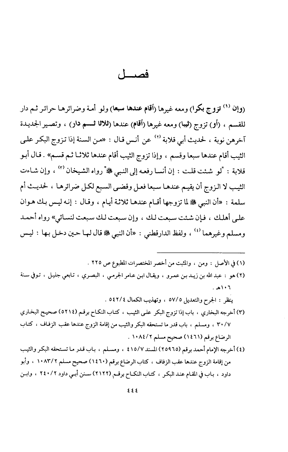 (¬4) أخرجه الإمام أحمد برقم (25965) المسند 7/ 415، ومسلم، باب قدر ما تستحقه البكر والثيب من إقامة الزوج عندها عقب الزفاف، كتاب الرضاع برقم (1460) صحيح مسلم 3/ 1082، وأبو داود، باب في المقام عند البكر، كتاب النكاح برقم (2122) سنن أبي داود 2/ 240، وابن =