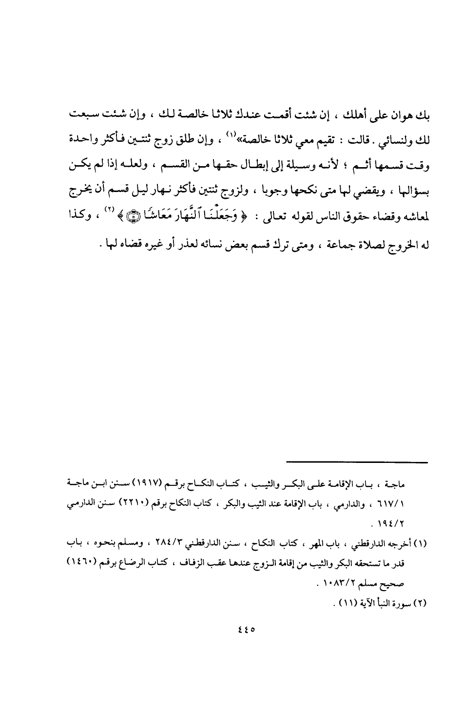 = ماجة، باب الإقامة على البكر والثيب، كتاب النكاح برقم (1917) سنن ابن ماجة 1/ 617، والدارمي، باب الإقامة عند الثيب والبكر، كتاب النكاح برقم (2210) سنن الدارمي 2/ 194.