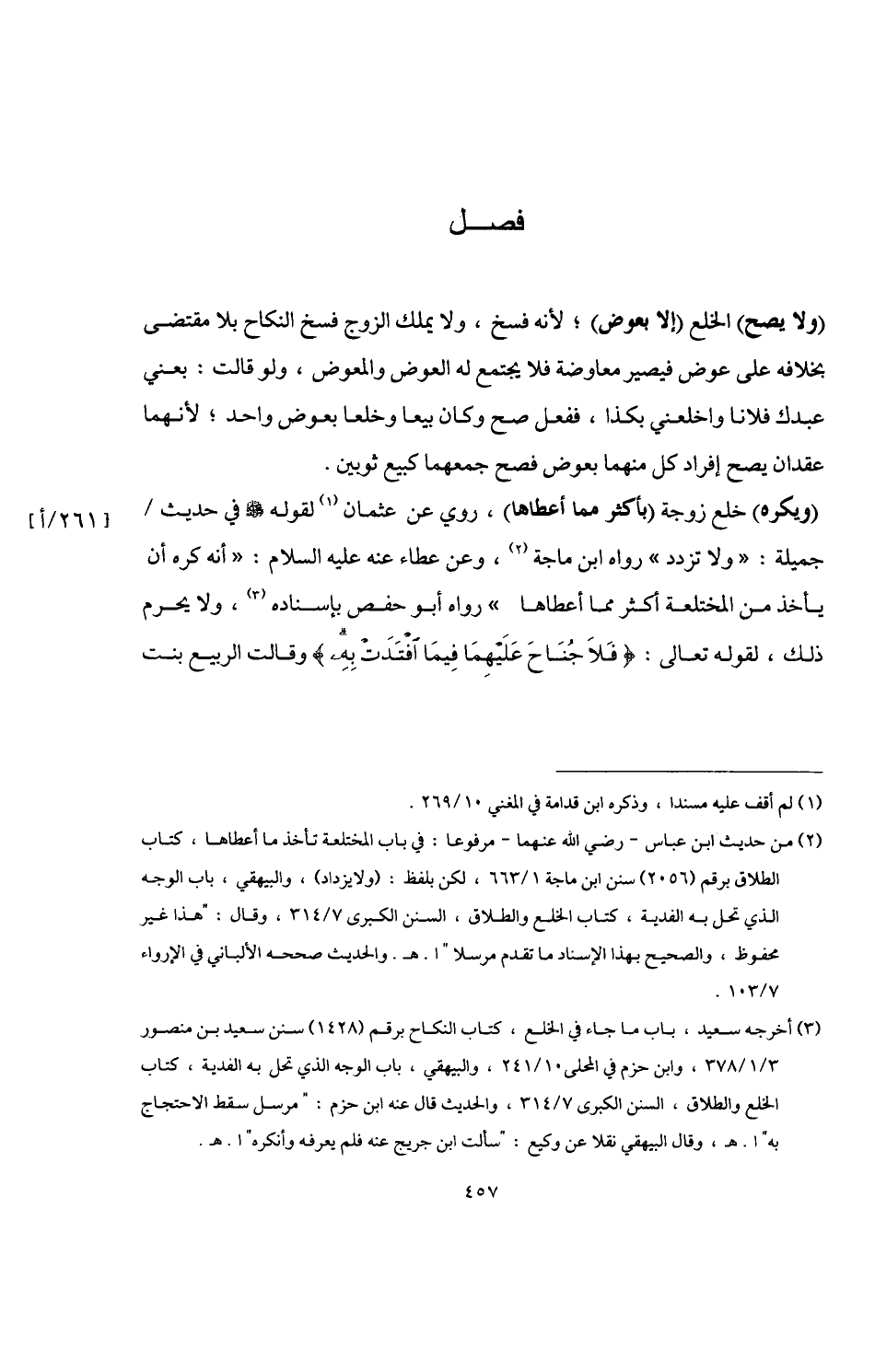 (¬2) من حديث ابن عباس -رضي اللَّه عنهما- مرفوعا: في باب المختلعة تأخذ ما أعطاها، كتاب الطلاق برقم (2056) سنن ابن ماجة 1/ 663، لكن بلفظ: (ولا يزداد)، والبيهقي، باب الوجه الذي تحل به الفدية، كتاب الخلع والطلاق، السنن الكبرى 7/ 314، وقال: "هذا غير محفوظ، والصحيح بهذا الإسناد ما تقدم مرسلا" ا. هـ. والحديث صححه الألباني في الإرواء 7/ 103.