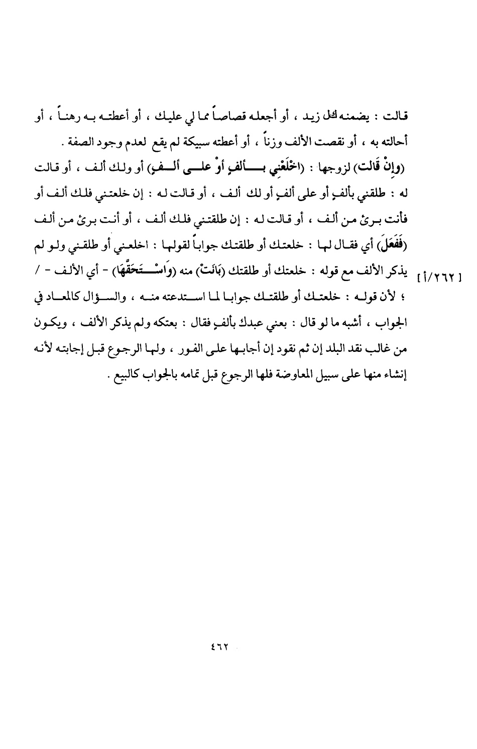 (وإِنْ قَالت) لزوجها: (اخْلَعْنِي بألفٍ أوْ على ألفٍ) أو ولك ألف، أو قالت له: طلقني بألفٍ أو على ألفٍ أو لك ألف، أو قالت له: إن خلعتني فلك ألف أو فأنت برئ من ألف، أو قالت له: إن طلقتني فلك ألف، أو أنت برئ من ألف (فَفَعَلَ) أي فقال لها: خلعتك أو طلقتك جوابًا لقولها: اخلعني أو طلقني ولو لم يذكر الألف مع قوله: خلعتك أو طلقتك (بَانَتْ) منه (وَاسْتَحَقَّهَا) -أي الألف-؛ لأن قوله: خلعتك أو طلقتك جوابا لما استدعته منه، والسؤال كالمعاد في الجواب، أشبه ما لو قال: بعني عبدك بألف فقال: بعتكه ولم يذكر الألف، ويكون من غالب نقد البلد إن ثم نقود إن أجابها على الفور، ولها الرجوع قبل إجابته لأنه إنشاء منها على سبيل المعاوضة فلها الرجوع قبل تمامه بالجواب كالبيع.