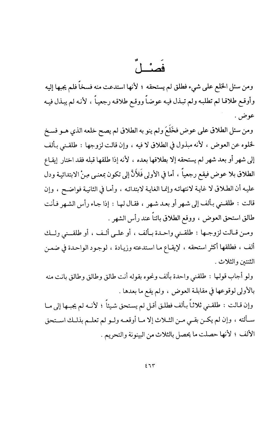 ومن سئل الطلاق على عوض فخَلَعَ ولم ينو به الطلاق لم يصح خلعه الذي هو فسخ لخلوه عن العوض، لأنه مبذول في الطلاق لا فيه، وإن قالت لزوجها: طلقني بألف إلى شهر أو بعد شهر لم يستحقه إلا بطلاقها بعده، لأنه إذا طلقها قبله فقد اختار إيقاع الطلاق بلا عوض فيقع رجعيًا، أما في الأولى فَلأَنَّ إلى تكون بمعنى مِنْ الابتدائية ودل عليه أن الطلاق لا غاية لانتهائه وإنما الغاية لابتدائه، وأما في الثانية فواضح، وإن قالت: طلقني بألف إلى شهر أو بعد شهر، فقال لها: إذا جاء رأس الشهر فأنت طالق استحق العوض، ووقع الطلاق بائنًا عند رأس الشهر.