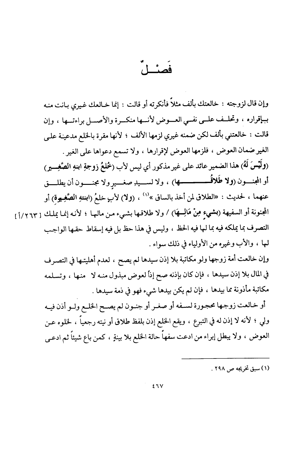 (ولَيْسَ لَهُ) هذا الضمير عائد على غير مذكور أي ليس لأب (خُلعُ زوجةِ ابنهِ الصَّغِير) أو المجنون (ولا طَلاقُها)، ولا لسيدِ صغيرٍ ولا مجنون أن يطلق عنهما، لحديث: "الطلاق لمن أخذ بالساق" (¬1)، (ولا) لأبٍ خلعُ (ابنتهِ الصَّغِيرةِ) أو المجنونة أو السفيهة (بشيءٍ مِنْ مَالِهَا) ولا طلاقها بشيء من مالها؛ لأنه إنما يملك التصرف بما يملكه فيه بما لها فيه الحظ، وليس في هذا حظ بل فيه إسقاط حقها الواجب لها، والأب وغيره من الأولياء في ذلك سواء.