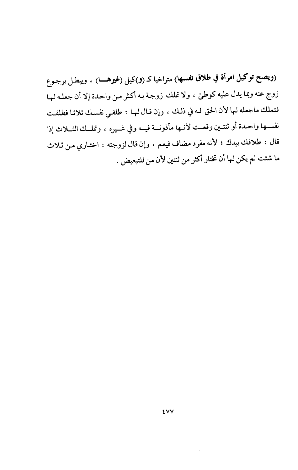 (ويصح توكيل امرأة في طلاق نفسها) متراخيا كـ (و) كيل (غيرها)، ويبطل برجوع زوج عنه وبما يدل عليه كوطئ، ولا تملك زوجة به أكثر من واحدة إلا أن جعله لها فتملك ما جعله لها لأن الحق له في ذلك، وإن قال لها: طلقي نفسك ثلاثا فطلقت نفسها واحدة أو ثنتين وقعت لأنها مأذونة فيه وفي غيره، وتملك الثلاث إذا قال: طلاقك بيدك؛ لأنه مفرد مضاف فيعم، وإن قال لزوجته: اختاري من ثلاث ما شئت لم يكن لها أن تختار أكثر من ثنتين لأن من للتبعيض.