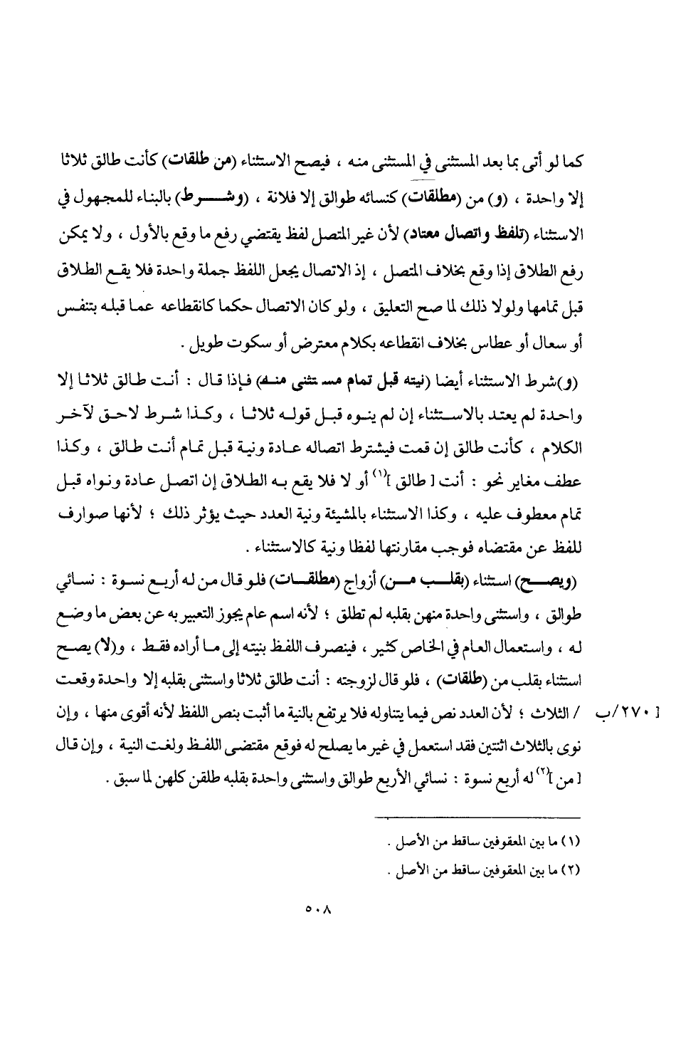 كما لو أتى بما بعد المستثنى في المستثنى منه، فيصح الاستثناء (من طلقات) كأنت طالق ثلاثا إلا واحدة، (و) من (مطلقات) كنسائه طوالق إلا فلانة، (وشرط) بالبناء للمجهول في الاستثناء (تلفظ واتصال معتاد) لأن غير المتصل لفظ يقتضي رفع ما وقع بالأول، ولا يمكن رفع الطلاق إذا وقع بخلاف المتصل، إذ الاتصال يجعل اللفظ جملة واحدة فلا يقع الطلاق قبل تمامها ولولا ذلك لما صح التعليق، ولو كان الاتصال حكما كانقطاعه عما قبله بتنفس أو سعال أو عطاس بخلاف انقطاعه بكلام معترض أو سكوت طويل.
