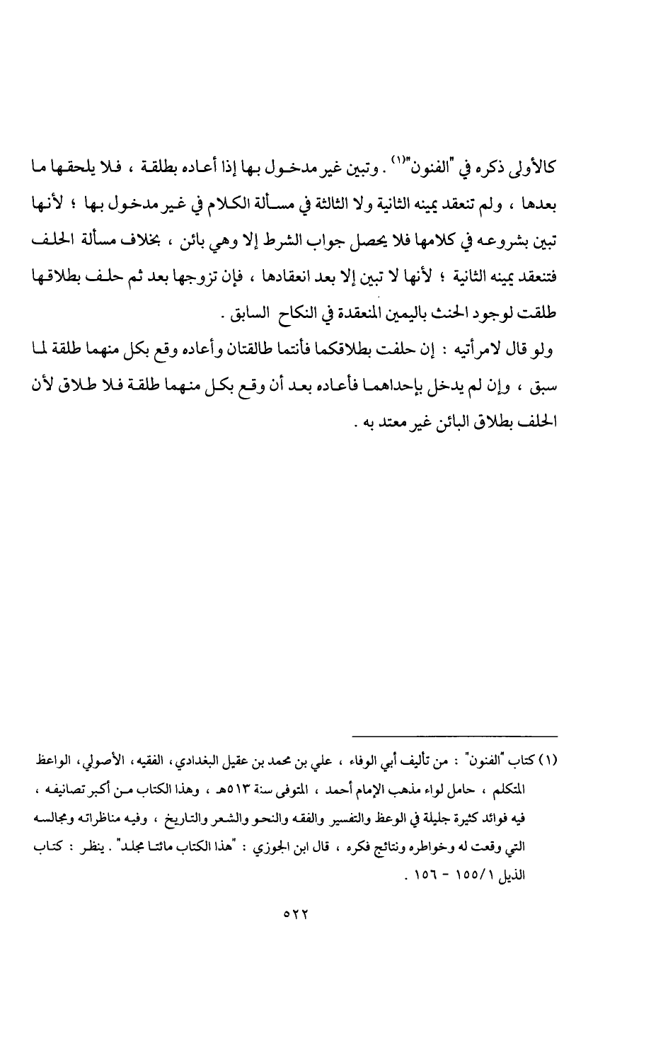 (¬1) كتاب "الفنون": من تأليف أبي الوفاء، علي بن محمد بن عقيل البغدادي، الفقيه، الأصولي، الواعظ المتكلم، حامل لواء مذهب الإمام أحمد، المتوفى سنة 513 هـ، وهذا الكتاب من أكبر تصانيفه، فيه فوائد كثيرة جليلة في الوعظ والتفسير والفقه والنحو والشعر والتاريخ، وفيه مناظراته ومجالسه التي وقعت له وخواطره ونتائج فكره، قال ابن الجوزي: "هذ الكتاب مائتا مجلد". ينظر: كتاب الذيل 1/ 155 - 156.