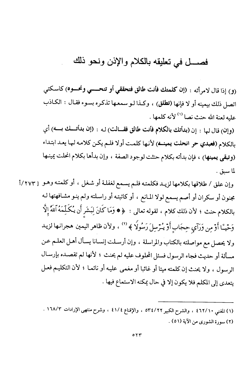 وإن علق طلاقها بكلامها لزيد فكلمته فلم يسمع لغفلة أو شغل، أو كلمته وهو مجنون أو سكران أو أصم يسمع لولا المانع، أو كاتبته أو راسلته ولم ينو مشافهتها له بالكلام حنث؛ لأن ذلك كلام، لقوله تعالى: {وَمَا كَانَ لِبَشَرٍ أَنْ يُكَلِّمَهُ اللَّهُ إِلَّا وَحْيًا أَوْ مِنْ وَرَاءِ حِجَابٍ أَوْ يُرْسِلَ رَسُولًا} (¬2)، ولأن ظاهر اليمين هجرانها لزيد ولا يحصل مع مواصلته بالكتاب والمراسلة، وإن أرسلت إنسانا يسأل أهل العلم عن مسألة أو حديث فجاء الرسول فسئل المحلوف عليه لم يحنث؛ لأنها لم تقصده بإرسال الرسول، ولا يحنث إن كلمته ميتا أو غائبا أو مغمى عليه أو نائما؛ لأن التكليم فعل يتعدى إلى المكلم فلا يكون إلا في حال يمكنه الاستماع فيها.
