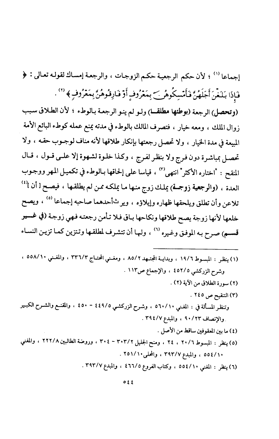 (وتحصل) الرجعة (بوطئها مطلقا) ولو لم ينو الرجعة بالوطء؛ لأن الطلاق سبب زوال الملك، ومعه خيار، فتصرف المالك بالوطء في مدته يمنع عمله كوطء البائع الأمة المبيعة في مدة الخيار، ولا تحصل رجعتها بإنكار طلاقها لأنه مناف لوجوب حقه، ولا تحصل بمباشرة دون فرج ولا بنظر لفرج، وكذا خلوة لشهوة إلا على قول، قال المنقح: "اختاره الأكثر" انتهى (¬3)، قياسا على إلحاقها بالوطء في تكميل المهر ووجوب العدة، (والرجعية زوجة) يملك زوج منها ما يملكه ممن لم يطلقها، فيصح [أن] (¬4) تلاعن وأن تطلق ويلحقها ظهاره وإيلاؤه، ويرث أحدهما صاحبه إجماعا (¬5)، ويصح خلعها لأنها زوجة يصح طلاقها ونكاحها باق فلا تأمن رجعته فهي زوجة (في غير قسم) صرح به الموفق وغيره (¬6)، ولها أن تتشرف لمطلقها وتتزين كما تزين النساء