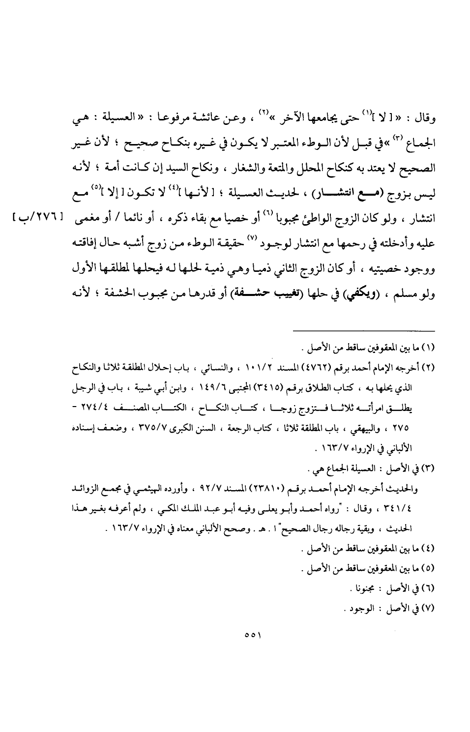 (¬2) أخرجه الإمام أحمد برقم (4762) المسند 2/ 101، والنسائي، باب إحلال المطلقة ثلاثا والنكاح الذي يحلها به، كتاب الطلاق برقم (3415) المجتبى 6/ 149، وابن أبي شيبة، باب في الرجل يطلق امرأته ثلاثا فتزوج زوجا، كتاب النكاح، الكتاب المصنف 4/ 274 - 275، والبيهقي، باب المطلقة ثلاثا، كتاب الرجعة، السنن الكبرى 7/ 375، وضعف إسناده الألباني في الإرواء 7/ 163.