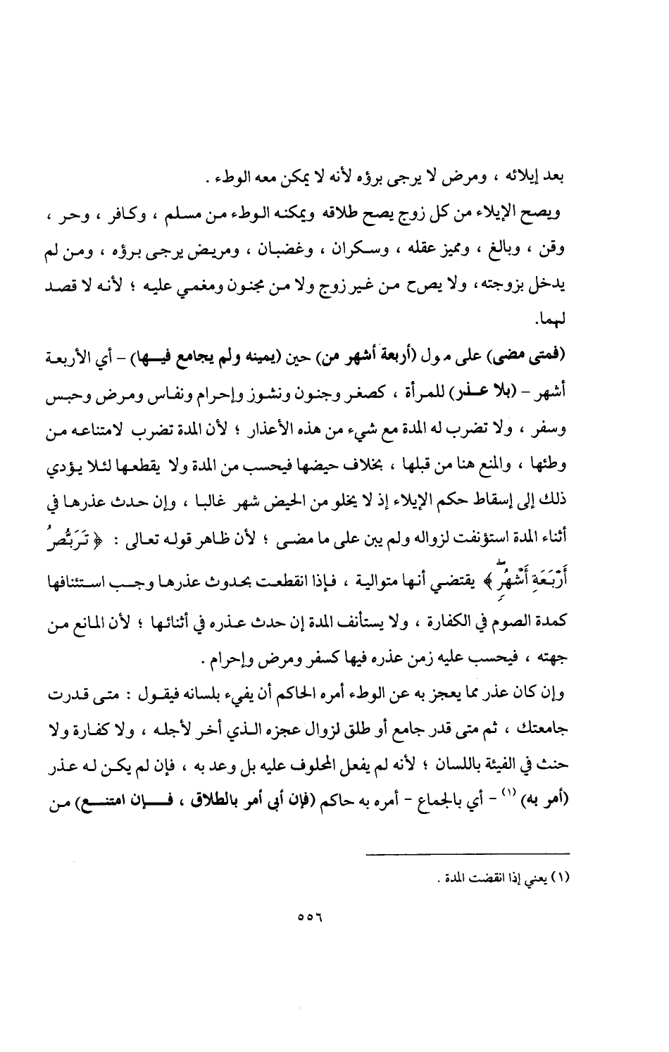 (فمتى مضى) على مول (أربعة أشهر من) حين (يمينه ولم يجامع فيها) -أي الأربعة أشهر- (بلا عذر) للمرأة، كصغر وجنون ونشوز وإحرام ونفاس ومرض وحبس وسفر، ولا تضرب له المدة مع شيء من هذه الأعذار؛ لأن المدة تضرب لامتناعه من وطئها، والمنع هنا من قبلها، بخلاف حيضها فيحسب من المدة ولا يقطعها لئلا يؤدي ذلك إلى إسقاط حكم الإيلاء إذ لا يخلو من الحيض شهر غالبا، وإن حدث عذرها في أثناء المدة استؤنفت لزواله ولم يبن على ما مضى؛ لأن ظاهر قوله تعالى: {تَرَبُّصُ أَرْبَعَةِ أَشْهُرٍ} يقتضي أنها متوالية، فإذا انقطعت بحدوث عذرها وجب استئنافها كمدة الصوم في الكفارة، ولا يستأنف المدة إن حدث عذره في أثنائها؛ لأن المانع من جهته، فيحسب عليه زمن عذره فيها كسفر ومرض وإحرام.