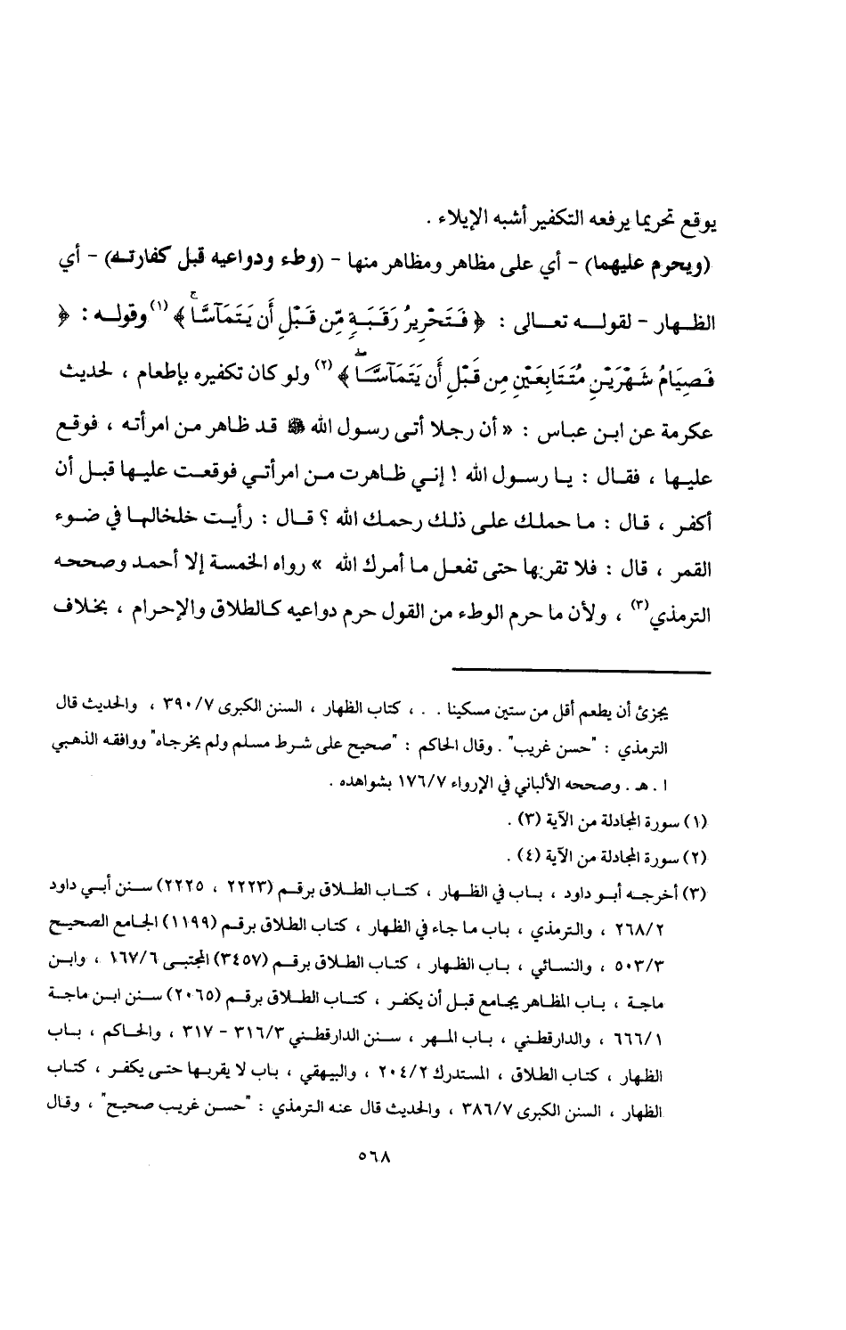 (¬3) أخرجه أبو داود، باب في الظهار، كتاب الطلاق برقم (2223، 2225) سنن أبي داود 2/ 268, والترمذي، باب ما جاء في الظهار، كتاب الطلاق برقم (1199) الجامع الصحيح 3/ 503، والنسائي، باب الظهار، كتاب الطلاق برقم (3457) المجتبى 6/ 167، وابن ماجة، باب المظاهر يجامع قبل أن يكفر، كتاب الطلاق برقم (2065) سنن ابن ماجة 1/ 666، والدارقطني، باب المهر، سنن الدارقطني 3/ 316 - 317، والحاكم، باب الظهار، كتاب الطلاق، المستدرك 2/ 204، والبيهقي، باب لا يقربها حتى يكفر، كتاب الظهار، السنن الكبرى 7/ 386، والحديث قال عنه الترمذي: "حسن غريب صحيح"، وقال =
