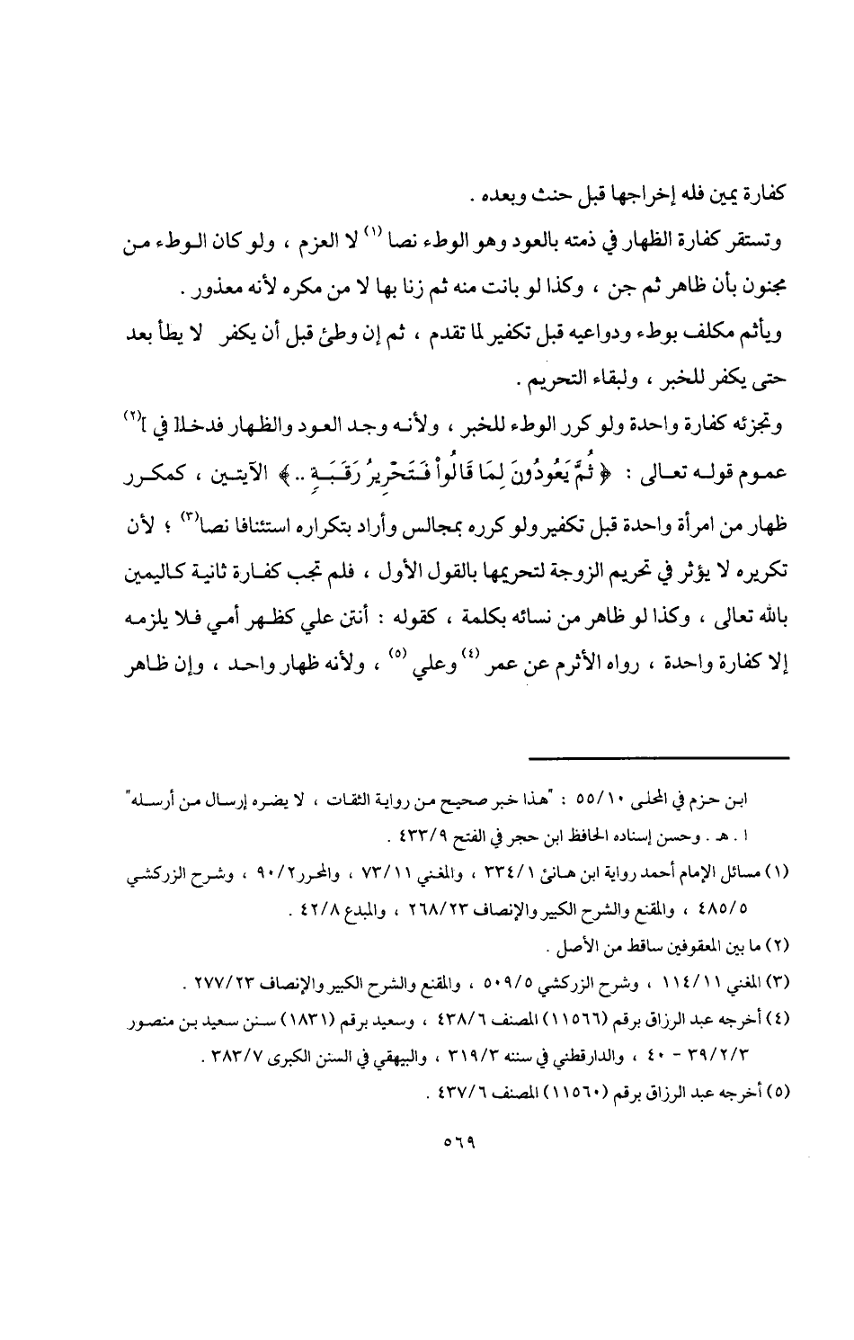 وتجزئه كفارة واحدة ولو كرر الوطء للخبر، ولأنه وجد العود والظهار فدخل [في] (¬2) عموم قوله تعالى: {ثُمَّ يَعُودُونَ لِمَا قَالُوا فَتَحْرِيرُ رَقَبَةٍ. .} الآيتين، كمكرر ظهار من امرأة واحدة قبل تكفير ولو كرره بمجالس وأراد بتكراره استئنافا نصا (¬3)؛ لأن تكريره لا يؤثر في تحريم الزوجة لتحريمها بالقول الأول، فلم تجب كفارة ثانية كاليمين باللَّه تعالى، وكذا لو ظاهر من نسائه بكلمة، كقوله: أنتن علي كظهر أمي فلا يلزمه إلا كفارة واحدة، رواه الأثرم عن عمر (¬4) وعلي (¬5)، ولأنه ظهار واحد، وإن ظاهر