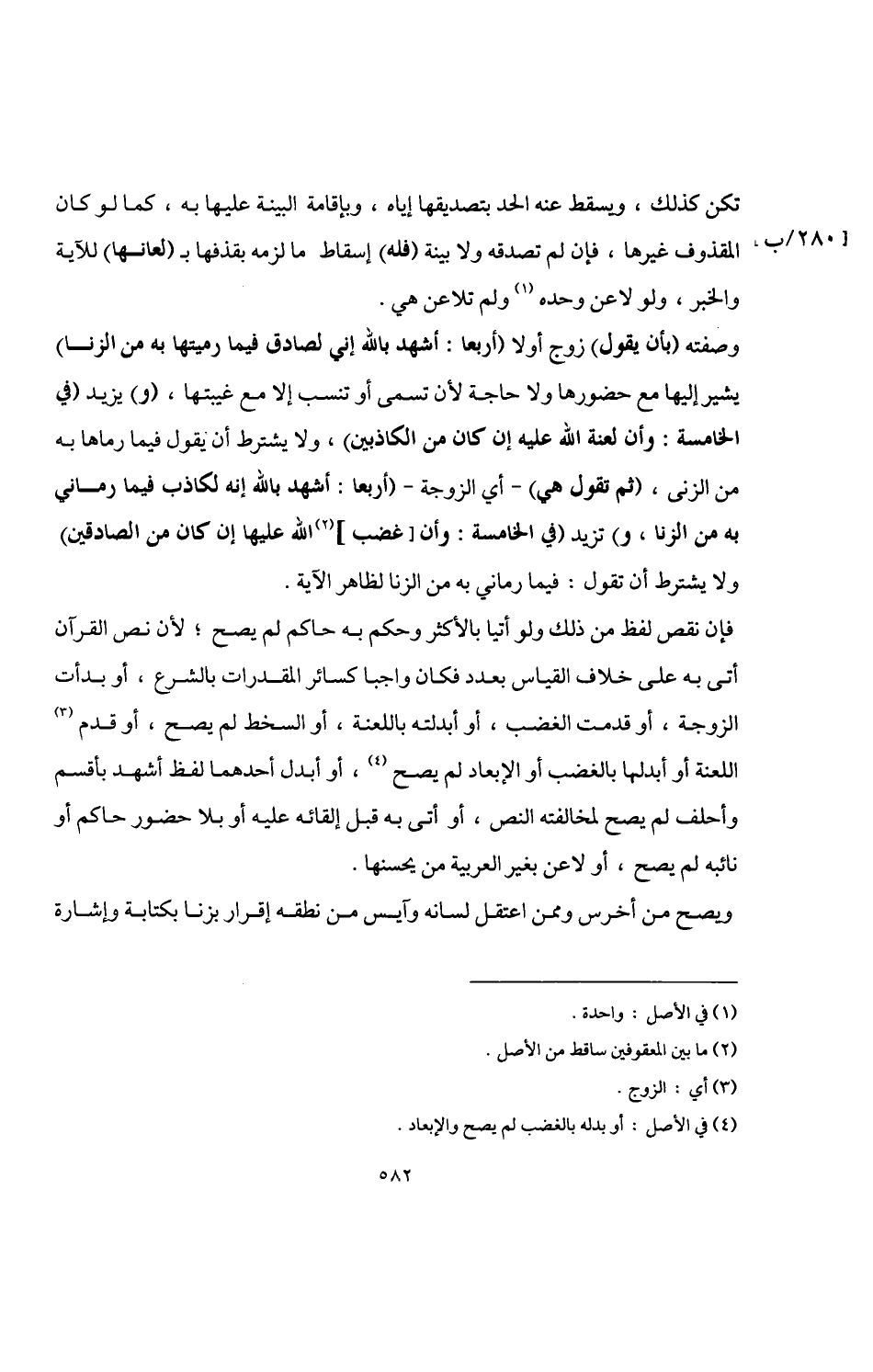 فإن نقص لفظ من ذلك ولو أتيا بالأكثر وحكم به حاكم لم يصح؛ لأن نص القرآن أتى به على خلاف القياس بعدد فكان واجبا كسائر المقدرات بالشرع، أو بدأت الزوجة، أو قدمت الغضب، أو أبدلته باللعنة، أو السخط لم يصح، أو قدم (¬3) اللعنة أو أبدلها بالغضب أو الإبعاد لم يصح (¬4)، أو أبدل أحدهما لفظ أشهد بأقسم وأحلف لم يصح لمخالفته النص، أو أتى به قبل إلقائه عليه أو بلا حضور حاكم أو نائبه لم يصح، أو لاعن بغير العربية من يحسنها.