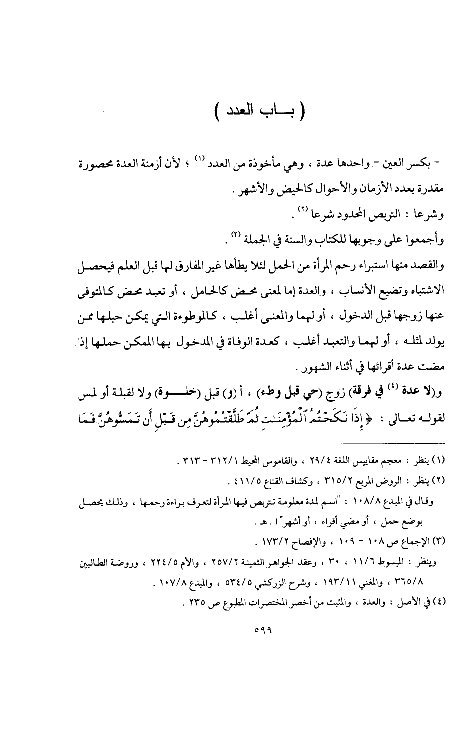 - بكسر العين- واحدها عدة، وهي مأخوذة من العدد (¬1)؛ لأن أزمنة العدة محصورة مقدرة بعدد الأزمان والأحوال كالحيض والأشهر.