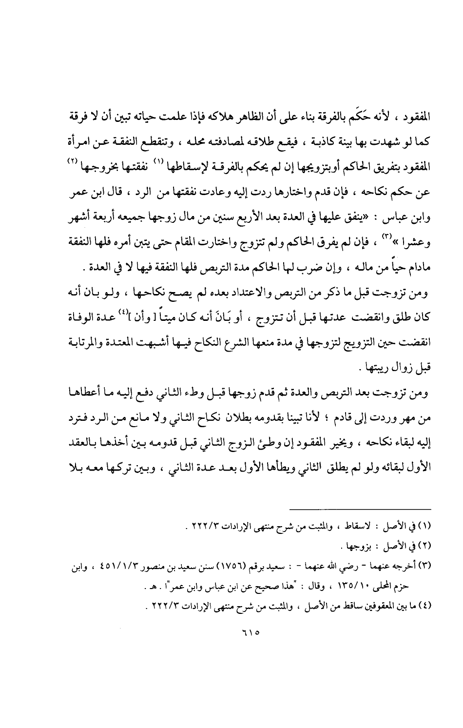 المفقود، لأنه حَكَم بالفرقة بناء على أن الظاهر هلاكه فإذا علمت حياته تبين أن لا فرقة كما لو شهدت بها بينة كاذبة، فيقع طلاقه لمصادفته محله، وتنقطع النفقة عن امرأة المفقود بتفريق الحاكم أو بتزويجها إن لم يحكم بالفرقة لإسقاطها (¬1) نفقتها بخروجها (¬2) عن حكم نكاحه، فإن قدم واختارها ردت إليه وعادت نفقتها من الرد، قال ابن عمر وابن عباس: "ينفق عليها في العدة بعد الأربع سنين من مال زوجها جميعه أربعة أشهر وعشرا" (¬3)، فإن لم يفرق الحاكم ولم تتزوج واختارت المقام حتى يتبن أمره فلها النفقة ما دام حيًا من ماله، وان ضرب لها الحاكم مدة التربص فلها النفقة فيها لا في العدة.