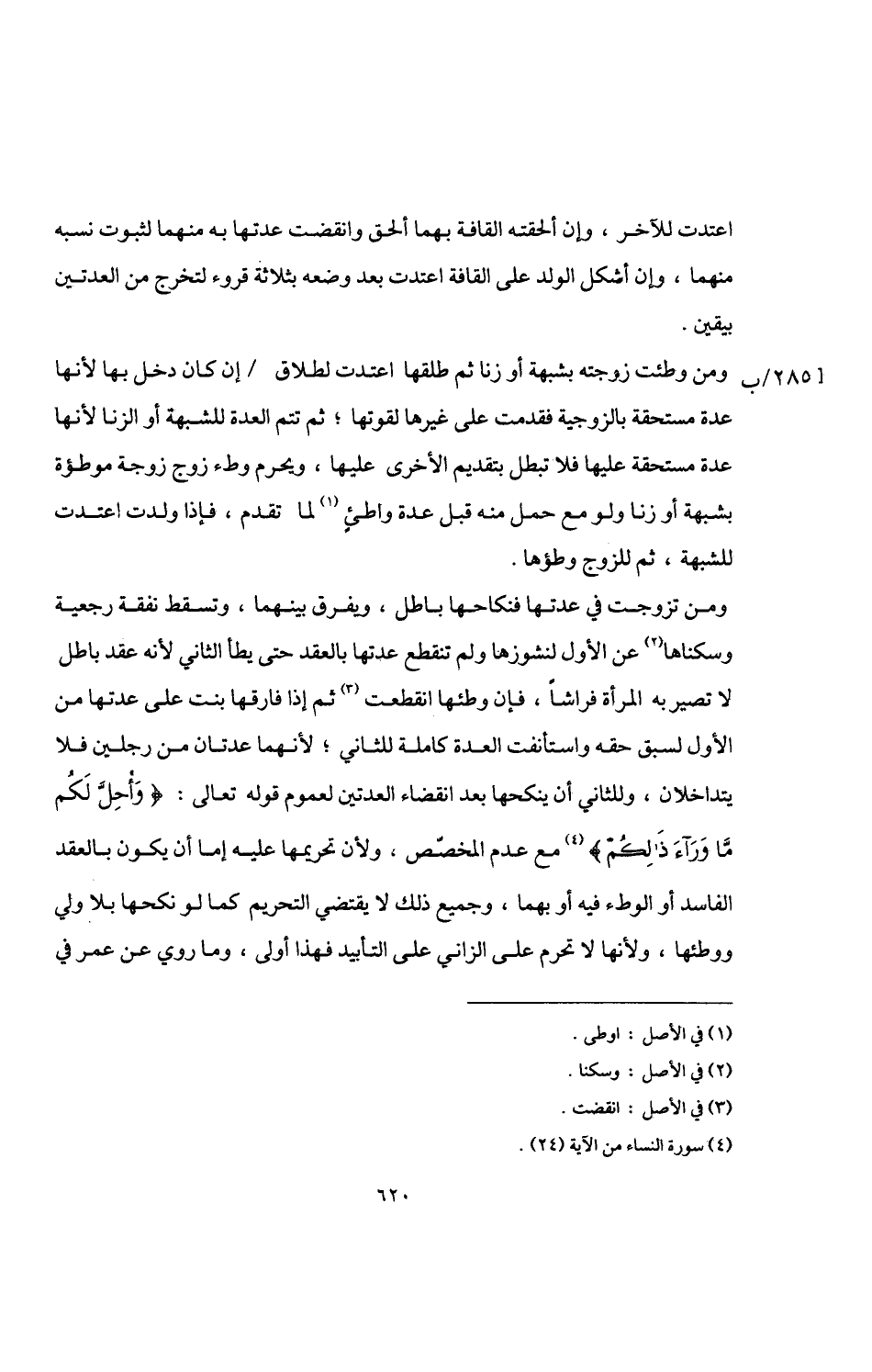 ومن تزوجت في عدتها فنكاحها باطل، ويفرق بينهما، وتسقط نفقة رجعية وسكناها (¬2) عن الأول لنشوزها ولم تنقطع عدتها بالعقد حتى يطأ الثاني لأنه عقد باطل لا تصير به المرأة فراشًا، فإن وطئها انقطعت (¬3) ثم إذا فارقها بنت على عدتها من الأول لسبق حقه واستأنفت العدة كاملة للثاني؛ لأنهما عدتان من رجلين فلا يتداخلان، وللثاني أن ينكحها بعد انقضاء العدتين لعموم قوله تعالى: {وَأُحِلَّ لَكُمْ مَا وَرَاءَ ذَلِكُمْ} (¬4) مع عدم المخصّص، ولأن تحريمها عليه إما أن يكون بالعقد الفاسد أو الوطء فيه أو بهما، وجميع ذلك لا يقتضي التحريم كما لو نكحها بلا ولي ووطئها، ولأنها لا تحرم على الزاني على التأبيد فهذا أولى، وما روي عن عمر في