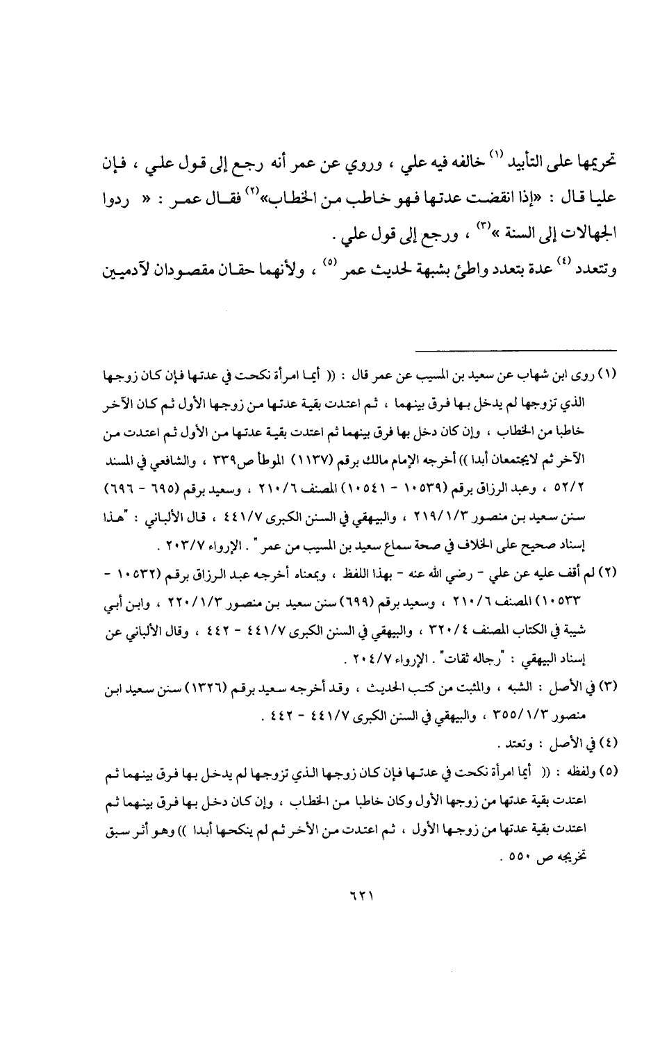 (¬1) روى ابن شهاب عن سعيد بن المسيب عن عمر قال: "أيما امرأة نكحت في عدتها فإن كان زوجها الذي تزوجها لم يدخل بها فرق بينهما، ثم اعتدت بقية عدتها من زوجها الأول ثم كان الآخر خاطبا من الخطاب، وإن كان دخل بها فرق بينهما ثم اعتدت بقية عدتها من الأول ثم اعتدت من الآخر ثم لا يجتمعان أبدا" أخرجه الإمام مالك برقم (1137) الموطأ ص 339، والشافعي والمسند 2/ 52، وعبد الرزاق برقم (10539 - 10541) المصنف 6/ 210، وسعيد برقم (695 - 696) سنن سعيد بن منصور 3/ 1/ 219، والبيهقي في السنن الكبرى 7/ 441، قال الألباني: "هذا إسناد صحيح على الخلاف في صحة سماع سعيد بن المسيب من عمر". الإرواء 7/ 203.