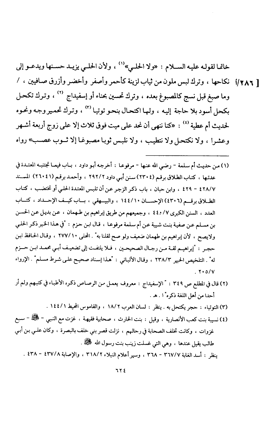 (¬1) من حديث أم سلمة -رضي اللَّه عنها- مرفوعا: أخرجه أبو داود، باب فيما تجتنبه المعتدة في عدتها، كتاب الطلاق برقم (2304) سنن أبي داود 2/ 292، وأحمد برقم (26041) المسند 7/ 428 - 429، وابن حبان، باب ذكر الزجر عن أن تلبس المعتدة الحلي أو تختضب، كتاب الطلاق برقم (4306) الإحسان 10/ 144، والبيهقي، باب كيف الإحداد، كتاب العدد، السنن الكبرى 7/ 440، وجميعهم من طريق إبراهيم بن طهمان، عن بديل عن الحسن بن مسلم عن صفية بنت شيبة عن أم سلمة مرفوعا، قال ابن حرم: "في هذا الخبر ذكر الحلي ولا يصح، لأن إبراهيم بن طهحان ضعيف ولو صح لقلنا به". المحلى 10/ 277، وقال الحافظ ابن حجر: "إبراهيم ثقة من رجال الصحيحين، فلا يلتفت إلى تضعيف أبي محمد ابن حزم له". التلخيص الحبير 3/ 238، وقال الألباني: "هذا إسناد صحيح على شرط مسلم". الإرواء 7/ 205.