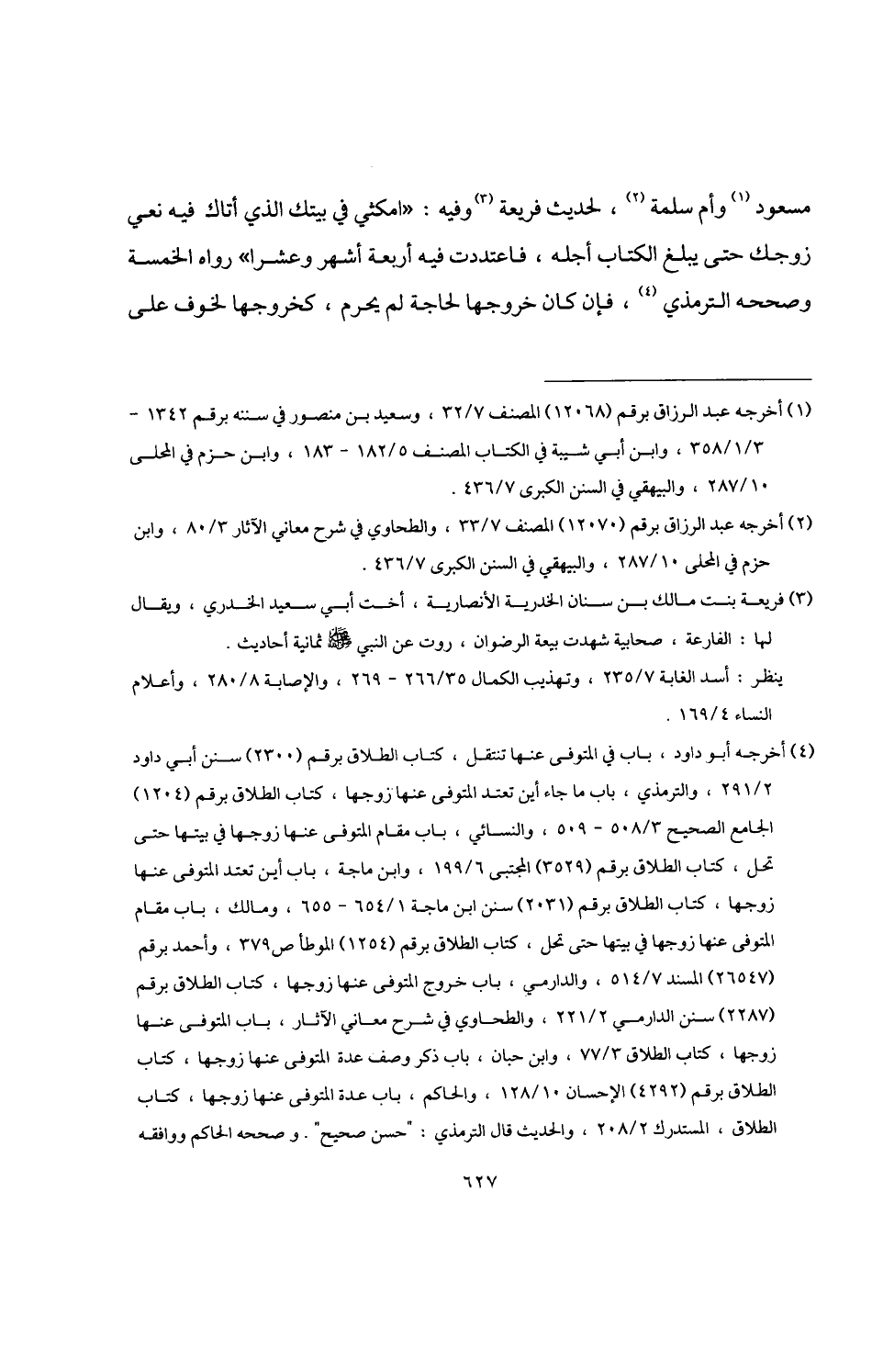 (¬4) أخرجه أبو داود، باب في المتوفى عنها تنتقل، كتاب الطلاق برقم (2300) سنن أبي داود 2/ 291، والترمذي، باب ما جاء أين تعتد المتوفى عنها زوجها، كتاب الطلاق برقم (1204) الجامع الصحيح 3/ 508 - 509، والنسائي، باب مقام المتوفى عنها زوجها في بيتها حتى تحل، كتاب الطلاق برقم (3529) المجتبى 6/ 199، وابن ماجة، باب أين تعتد المتوفى عنها زوجها، كتاب الطلاق برقم (2031) سنن ابن ماجة 1/ 654 - 655، ومالك، باب مقام المتوفى عنها زوجها في بيتها حتى تحل، كتاب الطلاق برقم (1254) الموطأ ص 379، وأحمد برقم (26547) المسند 7/ 514، والدارمي، باب خروج المتوفى عنها زوجها، كتاب الطلاق برقم (2287) سنن الدارمي 2/ 221، والطحاوي في شرح معاني الآثار، باب المتوفى عنها زوجها، كتاب الطلاق 3/ 77، وابن حبان، باب ذكر وصف عدة المتوفى عنها زوجها، كتاب الطلاق برقم (4292) الإحسان 10/ 128، والحاكم، باب عدة المتوفى عنها زوجها، كتاب الطلاق، المستدرك 2/ 208، والحديث قال الترمذي: "حسن صحيح". وصححه الحاكم ووافقه =