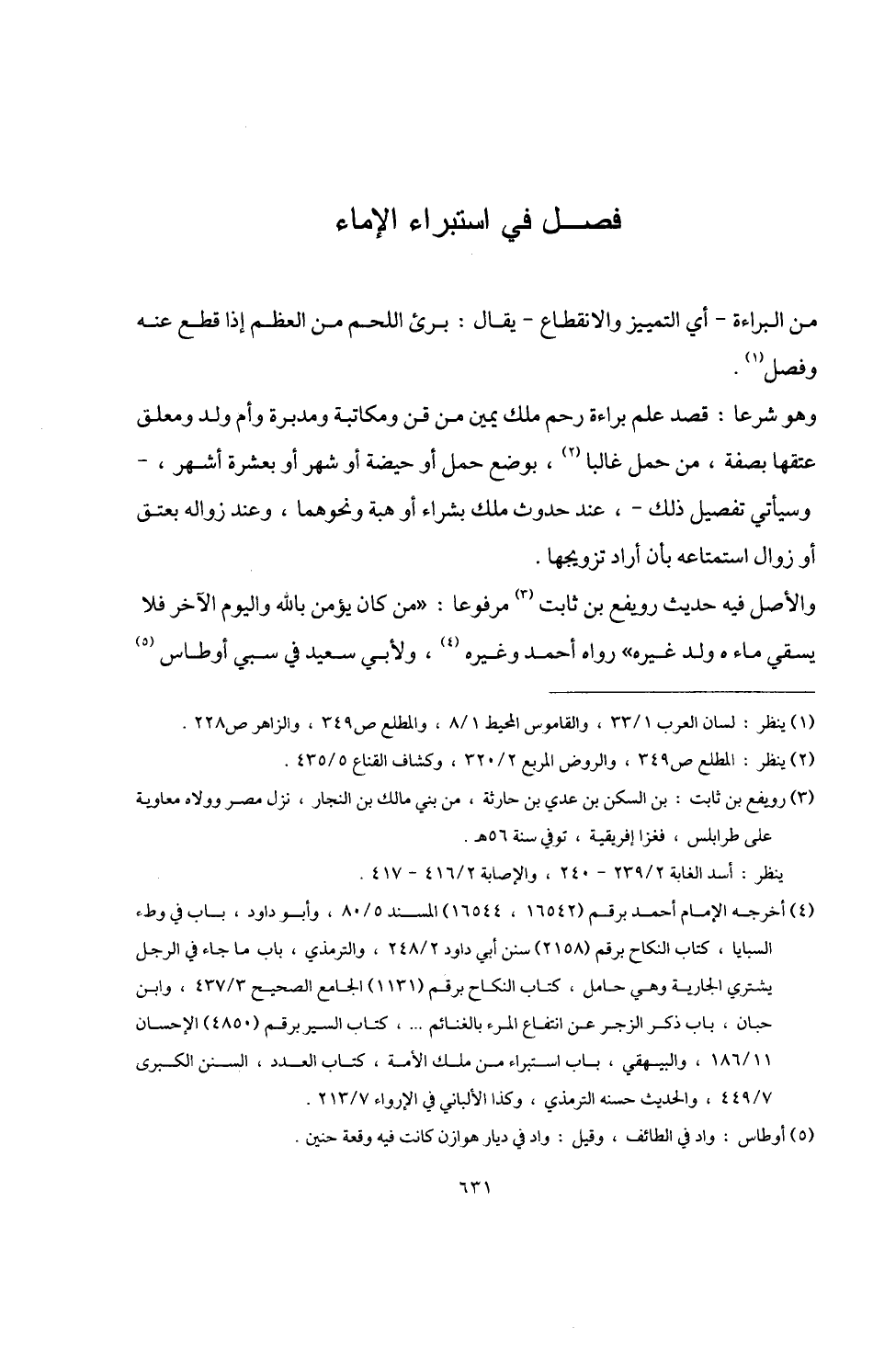 (¬4) أخرجه الإمام أحمد برقم (16542، 16544) المسند 5/ 80، وأبو داود، باب في وطء السبايا، كتاب النكاح برقم (2158) سنن أبي داود 2/ 248، والترمذي، باب ما جاء في الرجل يشتري الجارية وهي حامل، كتاب النكاح برقم (1131) الجامع الصحيح 3/ 437، وابن حبان، باب ذكر الزجر عن انتفاع المرء بالغنائم. . .، كتاب السير برقم (4850) الإحسان 11/ 186، والبيهقي، باب استبراء من ملك الأمة، كتاب العدد، السنن الكبرى 7/ 449، والحديث حسنه الترمذي، وكذا الألباني في الإرواء 7/ 213.