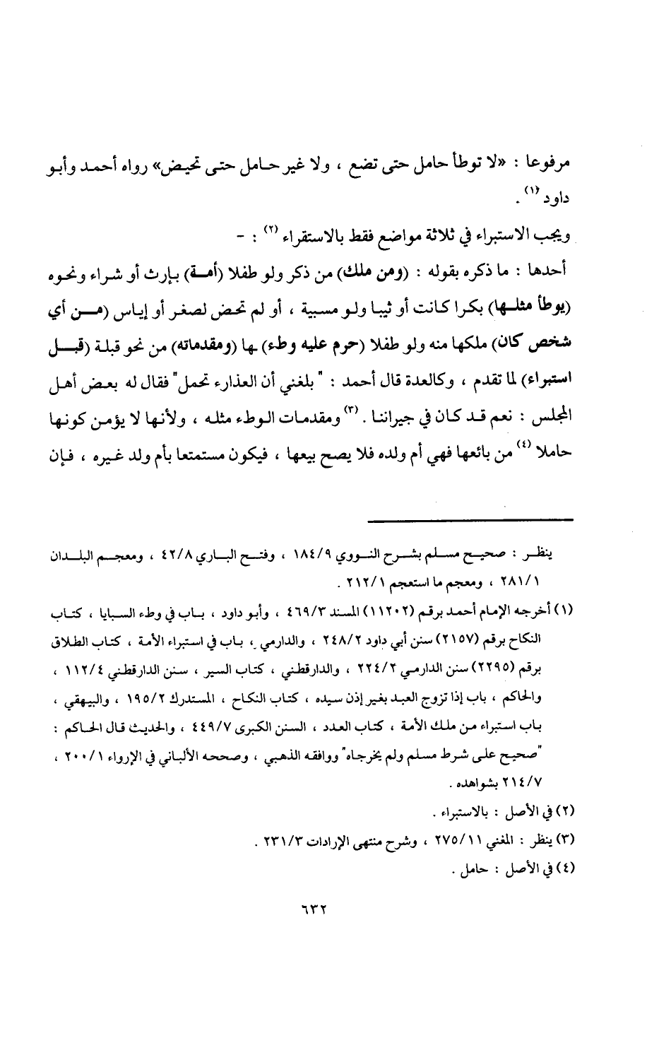 (¬1) أخرجه الإمام أحمد برقم (11202) المسند 3/ 469، وأبو داود، باب في وطء السبايا، كتاب النكاح برقم (2157) سنن أبي داود 2/ 248، والدارمي، باب في استبراء الأمة، كتاب الطلاق برقم (2295) سنن الدارمي 3/ 224، والدارقطني، كتاب السير، سنن الدارقطني 4/ 112، والحاكم، باب إذا تزوج العبد بغير إذن سيده، كتاب النكاح، المستدرك 2/ 195، والبيهقي، باب استبراء من ملك الأمة، كتاب العدد، السنن الكبرى 7/ 449، والحديث قال الحاكم: "صحيح على شرط مسلم ولم يخرجاه" ووافقه الذهبي، وصححه الألباني في الإرواء 1/ 200، 7/ 214 بشواهده.