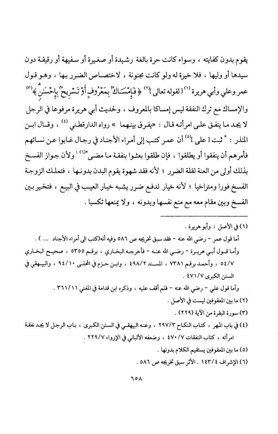 (¬4) في باب المهر، كتاب النكاح 3/ 297، وعنه البيهقي في السنن الكبرى، باب الرجل لا يجد نفقة امرأته، كتاب النفقات 7/ 470، وضعفه الألباني في الإرواء 7/ 229.