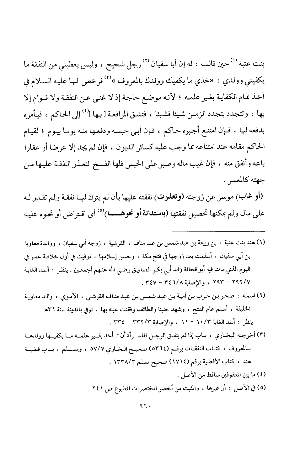 (¬3) أخرجه البخاري، باب إذا لم ينفق الرجل فللمرأة أن تاخذ بغير علمه ما يكفيها وولدها بالمعروف، كتاب النفقات برقم (5364) صحيح البخاري 7/ 57، ومسلم، باب قضية هند، كتاب الأقضية برقم (1714) صحيح مسلم 3/ 1338.