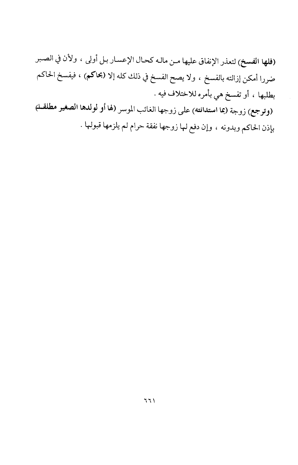 (فلها الفسخ) لتعذر الإنفاق عليها من ماله كحال الإعسار بل أولى، ولأن في الصبر ضررا أمكن إزالته بالفسخ، ولا يصح الفسخ في ذلك كله إلا (بحاكم)، فيفسخ الحاكم بطلبها، أو تفسخ هي بأمره للاختلاف فيه.