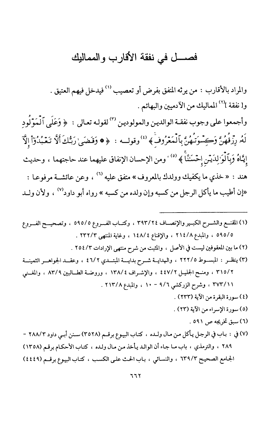 وأجمعوا على وجوب نفقة الوالدين والمولودين (¬3) لقوله تعالى: {وَعَلَى الْمَوْلُودِ لَهُ رِزْقُهُنَّ وَكِسْوَتُهُنَّ بِالْمَعْرُوفِ} (¬4) وقوله: {وَقَضَى رَبُّكَ أَلَّا تَعْبُدُوا إِلَّا إِيَّاهُ وَبِالْوَالِدَيْنِ إِحْسَانًا} (¬5)، ومن الإحسان الإنفاق عليهما عند حاجتهما، وحديث هند: "خذي ما يكفيك وولدك بالمعروف" متفق عليه (¬6)، وعن عائشة مرفوعا: "إن أطيب ما يأكل الرجل من كسبه وإن ولده من كسبه" رواه أبو داود (¬7)، ولأن ولد
