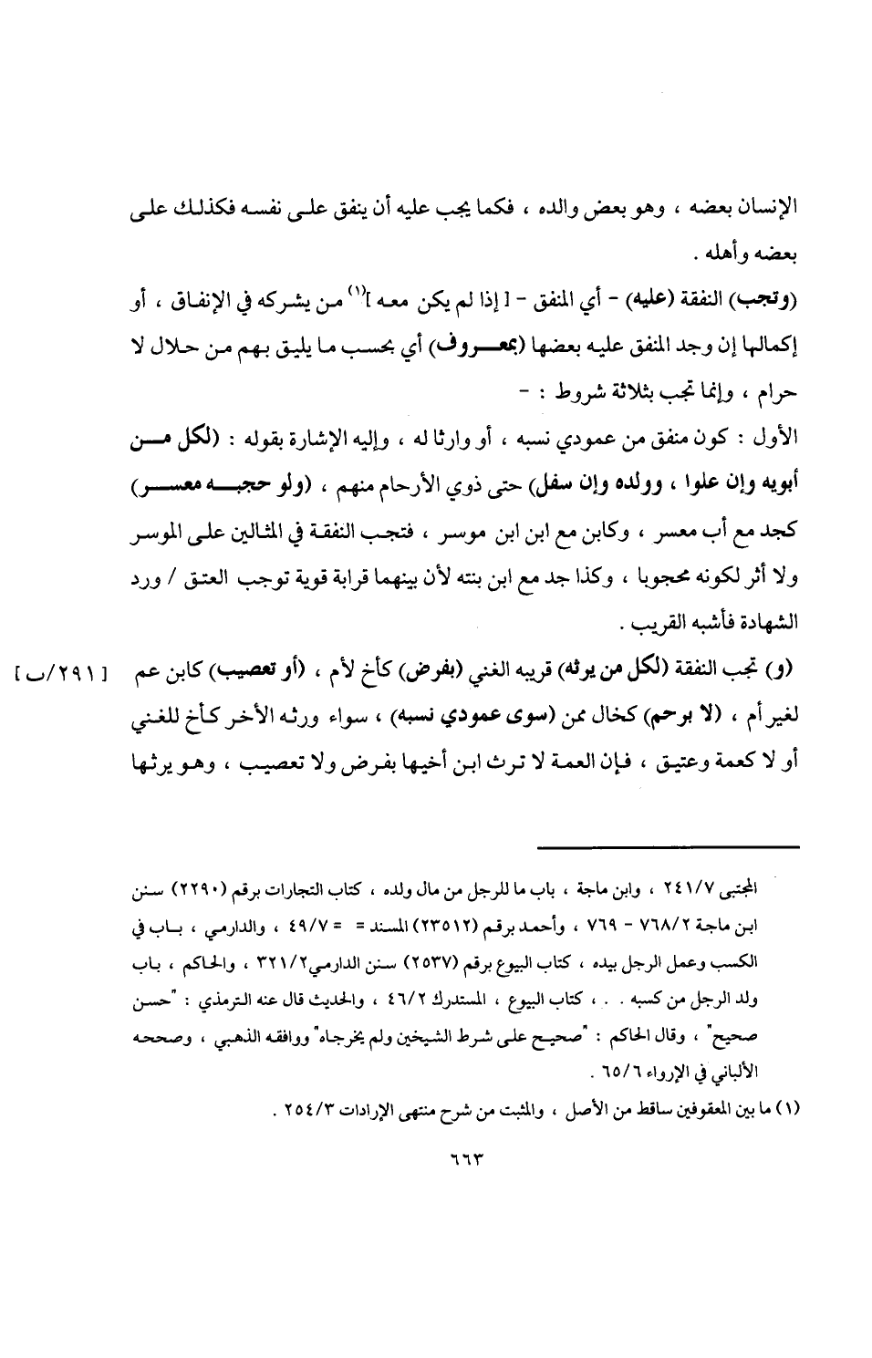 (وتجب) النفقة (عليه) -أي المنفق-[إذا لم يكن معه] (¬1) من يشركه في الإنفاق، أو إكمالها إن وجد المنفق عليه بعضها (بمعروف) أي بحسب ما يليق بهم من حلال لا حرام، وإنما تجب بثلاثة شروط: -
