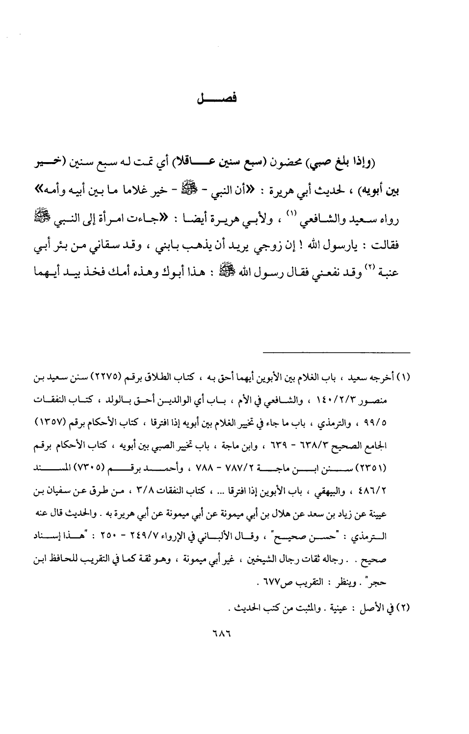 (¬1) أخرجه سعيد، باب الغلام بين الأبوين أيهما أحق به، كتاب الطلاق برقم (2275) سنن سعيد بن منصور 3/ 2/ 140، والشافعي في الأم، باب أي الوالدين أحق بالولد، كتاب النفقات 5/ 99، والترمذي، باب ما جاء في تخيير الغلام بين أبويه إذا افترقا، كتاب الأحكام برقم (1357) الجامع الصحيح 3/ 638 - 639، وابن ماجة، باب تخيير الصبي بين أبويه، كتاب الأحكام برقم (2351) سنن ابن ماجة 2/ 787 - 788، وأحمد برقم (7305) المسند 2/ 486، والبيهقي، باب الأبوين إذا افترقا. . .، كتاب النفقات 8/ 3، من طرق عن سفيان بن عيينة عن زياد بن سعد عن هلال بن أبي ميمونة عن أبي ميمونة عن أبي هريرة به. والحديث قال عنه الترمذي: "حسن صحيح"، وقال الألباني في الإرواء 7/ 249 - 250: "هذا إسناد صحيح. . رجاله ثقات رجال الشيخين، غير أبي ميمونة، وهو ثقة كما في التقريب للحافظ ابن حجر". وينظر: التقريب ص 677.
