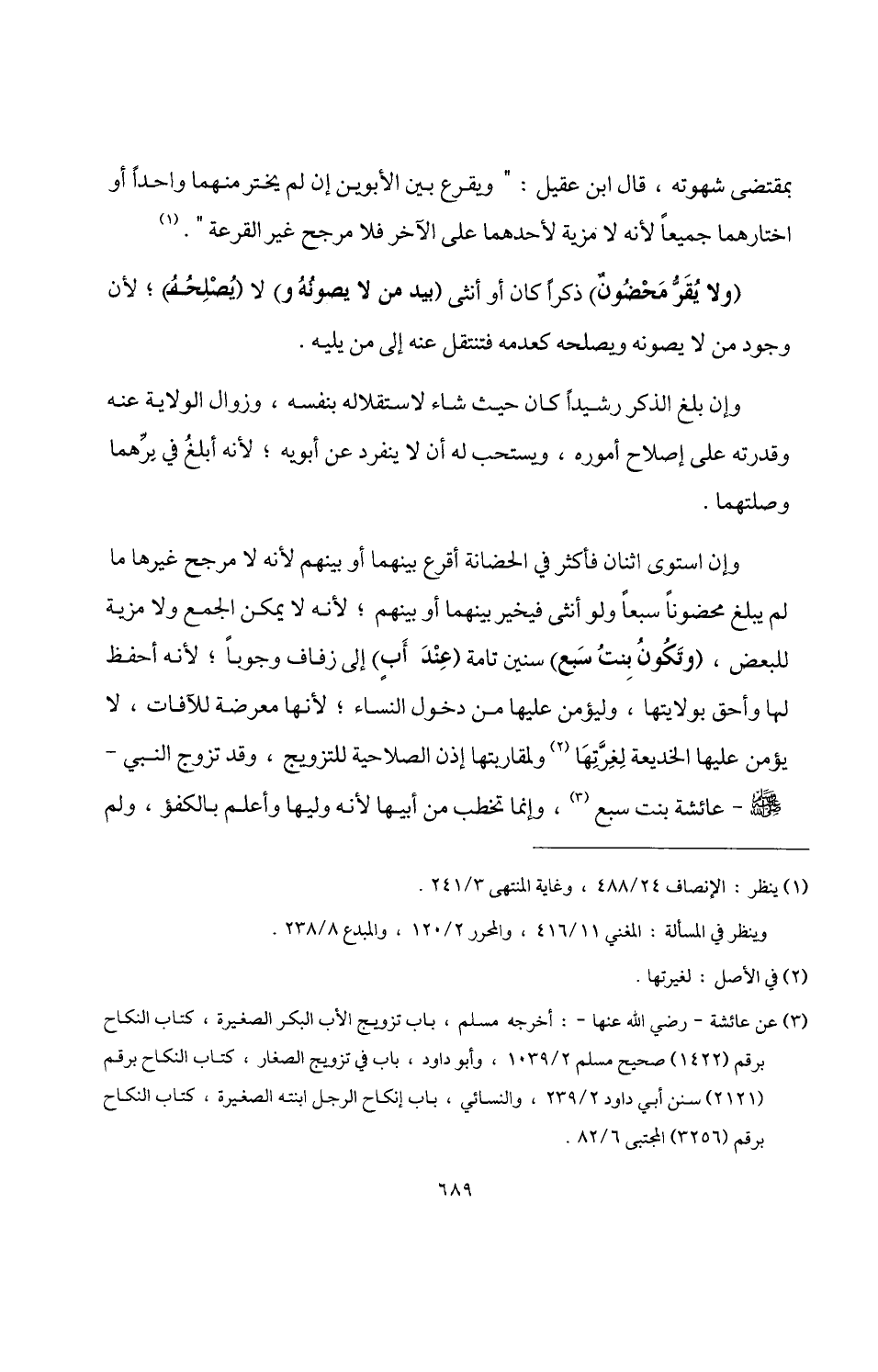 (¬3) عن عائشة -رضي اللَّه عنها-: أخرجه مسلم، باب تزويج الأب البكر الصغيرة، كتاب النكاح برقم (1422) صحيح مسلم 2/ 1039، وأبو داود، باب في تزويج الصغار، كتاب النكاح برقم (2121) سنن أبي داود 2/ 239، والنسائي، باب إنكاح الرجل ابنته الصغيرة، كتاب النكاح برقم (3256) المجتبى 6/ 82.