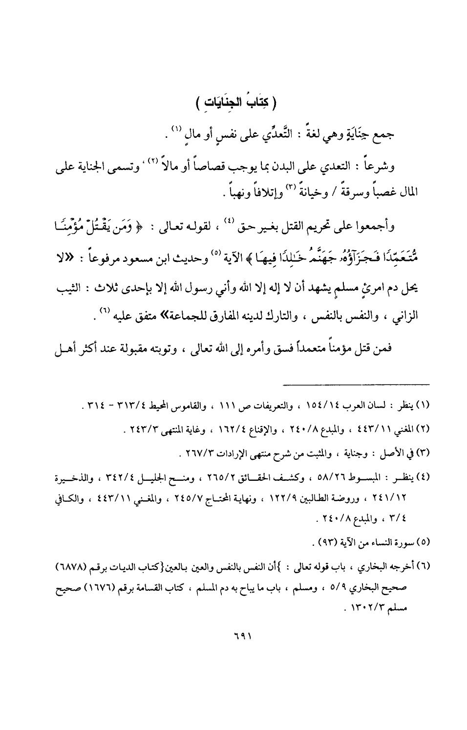 (¬6) أخرجه البخاري، باب قوله تعالى: {أَنَّ النَّفْسَ بِالنَّفْسِ وَالْعَيْنَ بِالْعَيْنِ} كتاب الديات برقم (6878) صحيح البخاري 9/ 5، ومسلم، باب ما يباح به دم المسلم، كتاب القسامة برقم (1676) صحيح مسلم 3/ 1302.