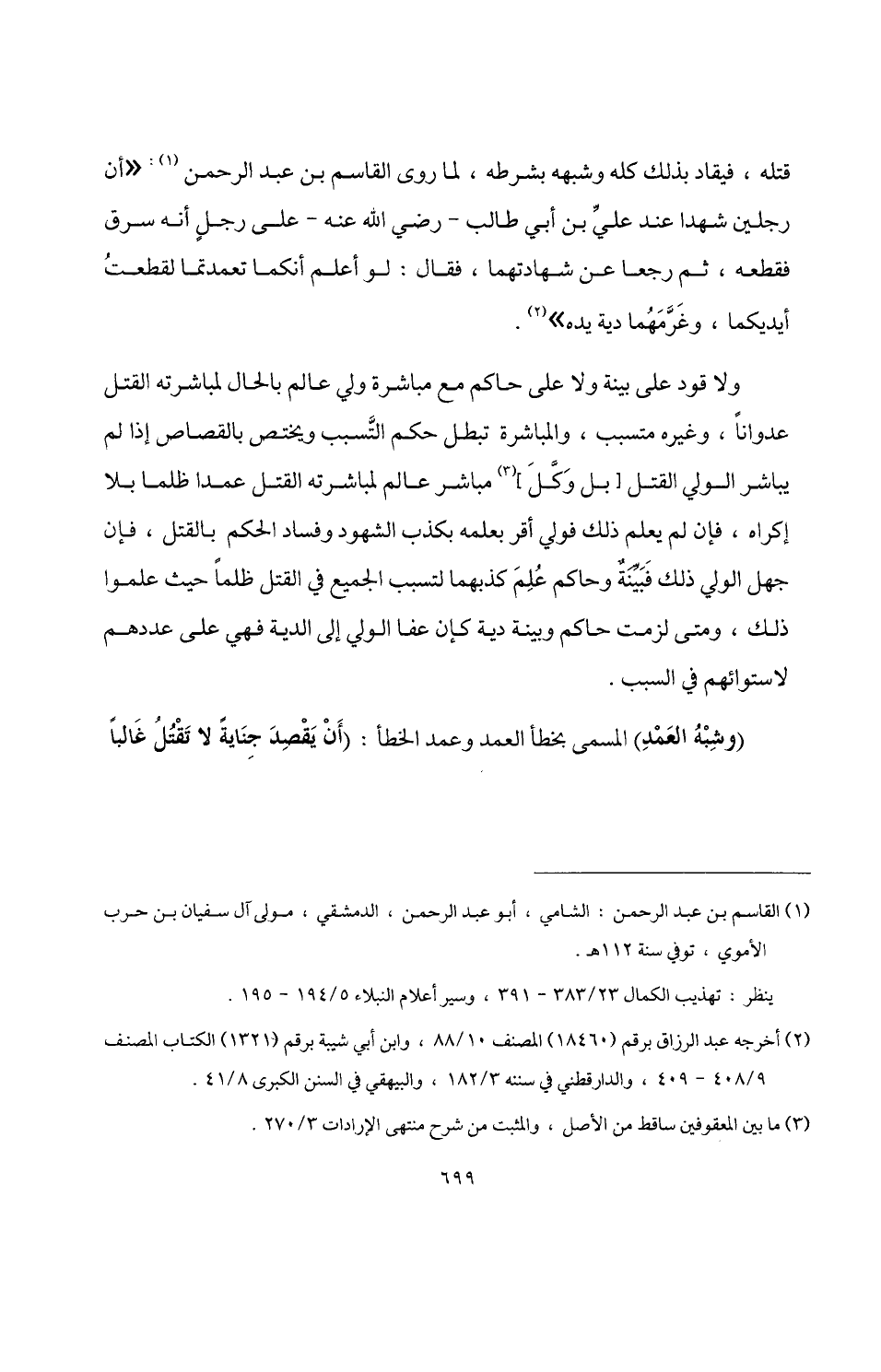 قتله، فيقاد بذلك كله وشبهه بشرطه، لما روى القاسم بن عبد الرحمن (¬1): "أن رجلين شهدا عند عليِّ بن أبي طالب -رضي اللَّه عنه- على رجلٍ أنه سرق فقطعه، ثم رجعا عن شهادتهما، فقال: لو أعلم أنكما تعمدتما لقطعتُ أيديكما، وغَرَّمَهُما دية يده" (¬2).