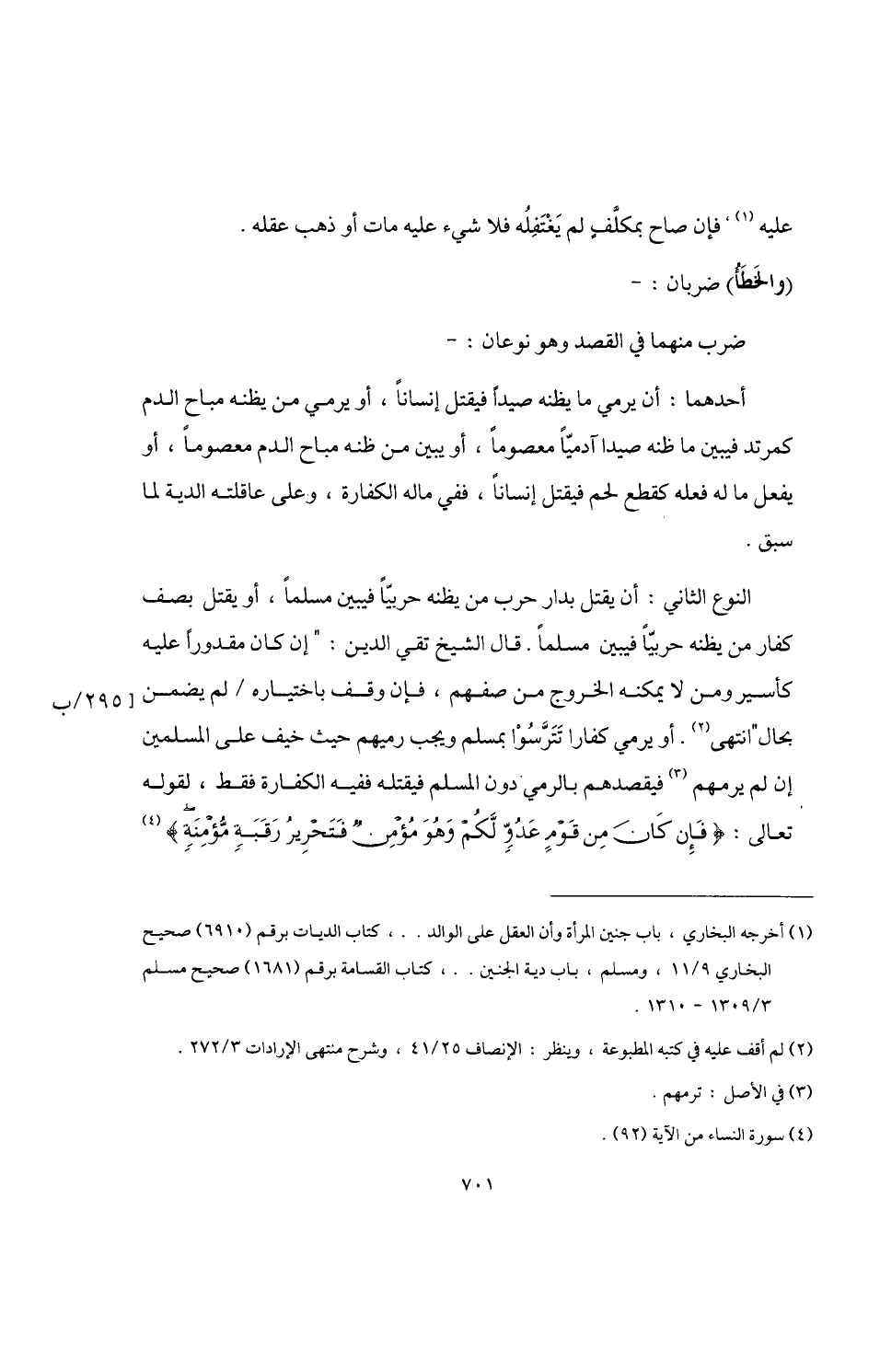 النوع الثاني: أن يقتل بدار حرب من يظنه حربيًّا فيبين مسلمًا، أو يقتل بصف كفار من يظنه حربيًّا فيبين مسلمًا. قال الشيخ تقي الدين: "إن كان مقدورًا عليه