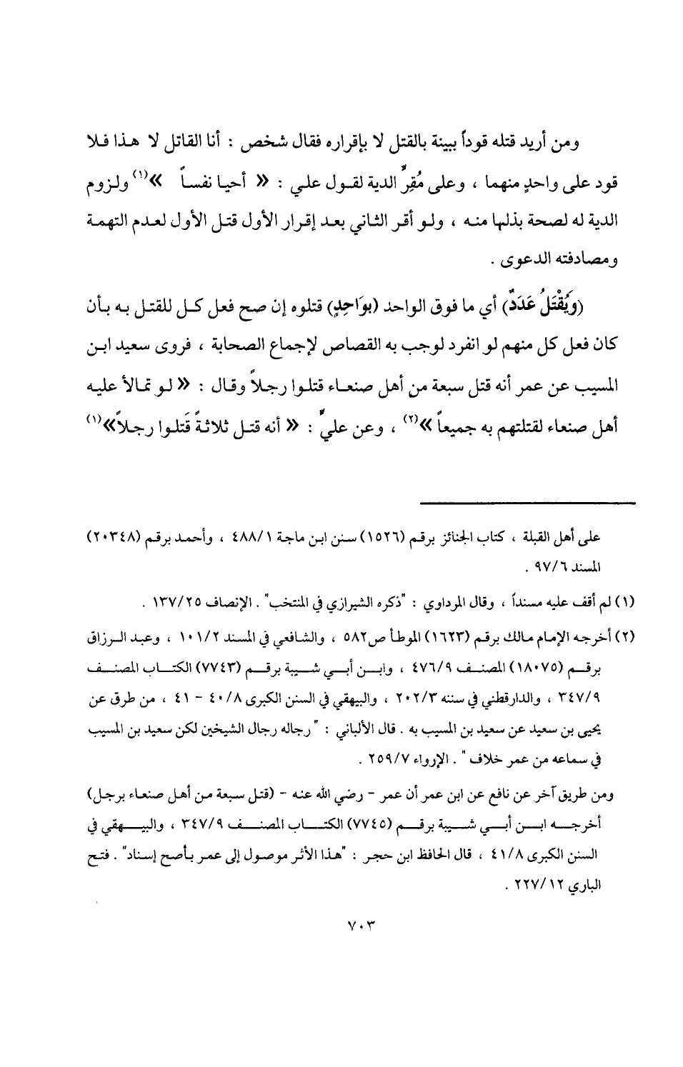 ومن طريق آخر عن نافع عن ابن عمر أن عمر -رضي اللَّه عنه- (قتل سبعة من أهل صنعاء برجل) أخرجه ابن أبي شيبة برقم (7745) الكتاب المصنف 9/ 347، والبيهقي في السنن الكبرى 8/ 41، قال الحافظ ابن حجر: "هذا الأثر موصول إلى عمر بأصح إسناد". فتح الباري 12/ 227.