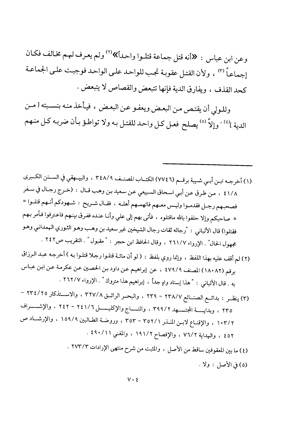 (¬2) لم أقف عليه بهذا اللفظ، وإنما روي بلفظ: (لو أن مائة قتلوا رجلا قتلوا به) أخرجه عبد الرزاق برقم (18082) المصنف 9/ 479، عن إبراهيم عن داود بن الحصين عن عكرمة عن ابن عباس به. قال الألباني: "هذا إسناد واهٍ جدًا، إبراهيم هذا متروك". الإرواء 7/ 262.
